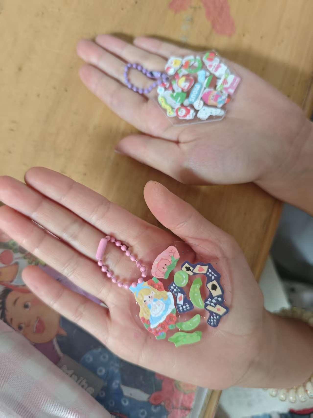 午休后的孩子们带着些许倦意,当看到桌上五颜六色的咕卡卡片、亮晶晶的星星亮片和卡通贴纸时,眼睛瞬间亮了起来。老师们先是示范和讲解了咕卡制作步骤,话音刚落,孩子们便迫不及待地动手创作。原本活泼跳脱的身影渐渐沉静下来,小脸上满是专注神情:有的用指尖轻轻捏起亮片比对位置,有的趴在桌上认真涂抹胶棒,还有的互相小声交流着贴纸搭配创意。教室里不时响起 “这个小熊贴在这里好看”“我的闪片撒啦” 的欢笑声,腼腆的孩子也在互动中慢慢放开了手脚。