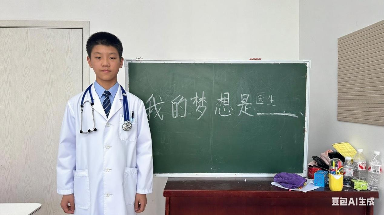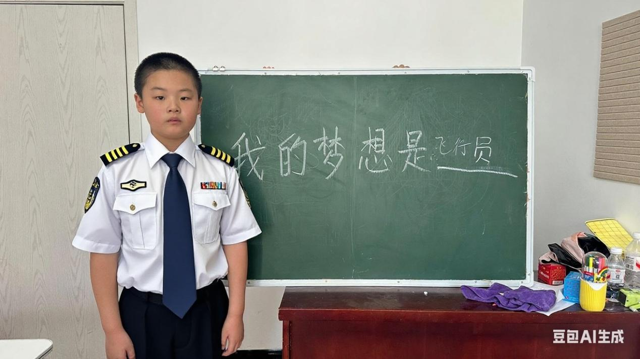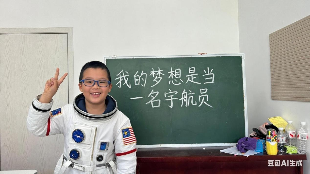 随后,他们认真地将梦想写在黑板上,这些梦想如同种子,在温暖与关爱中悄然扎根。在“与未来的自己见面”环节,王老师借助AI技术,将孩子们的梦想具象化:身着白大褂的学生姿态端正,眼神中透着守护生命的力量;身着军装的孩子身姿挺拔,满是保家卫国的力量。李嘉轩望着自己身着宇航服的照片异常激动:“这就是未来的我!”