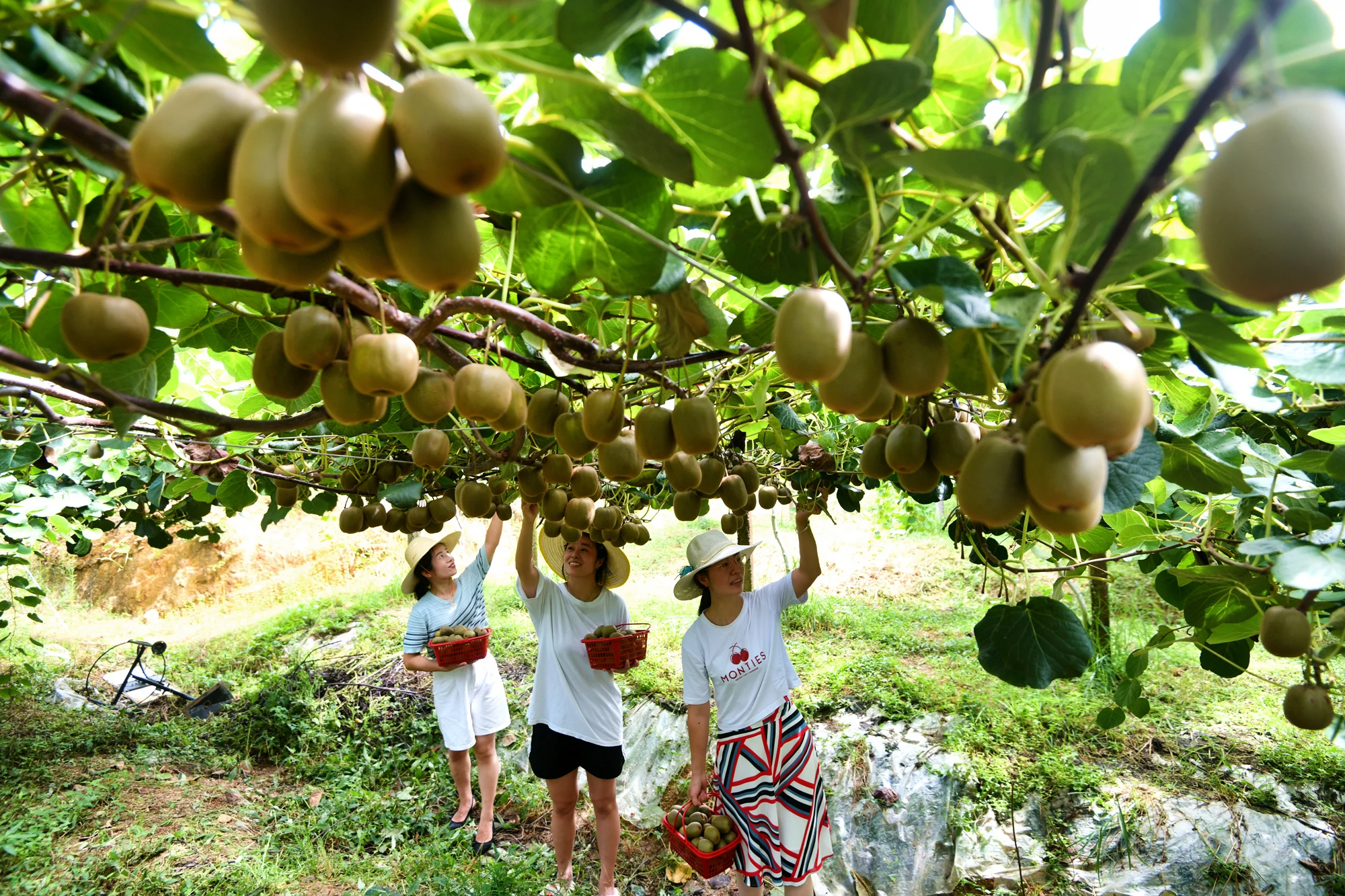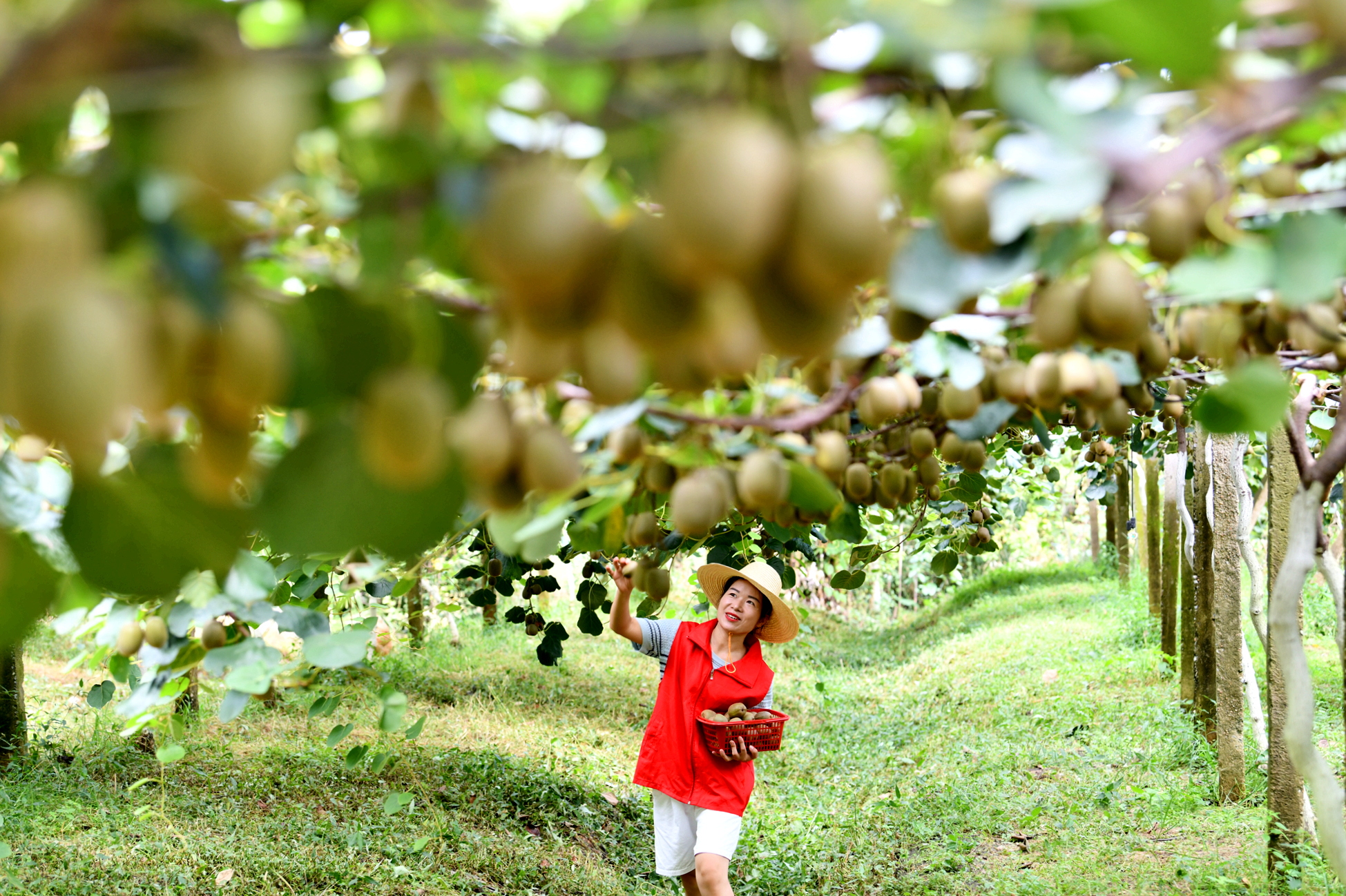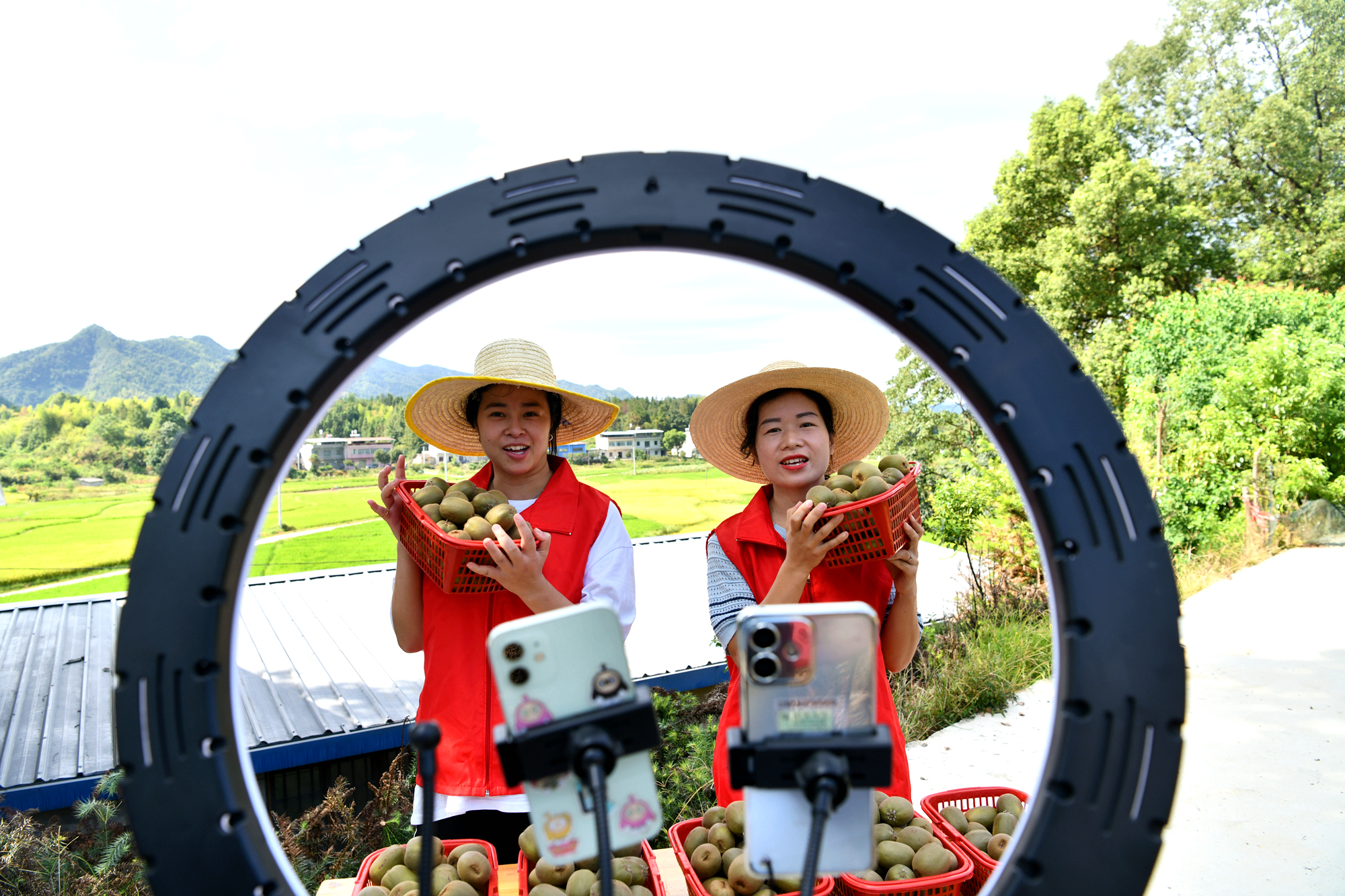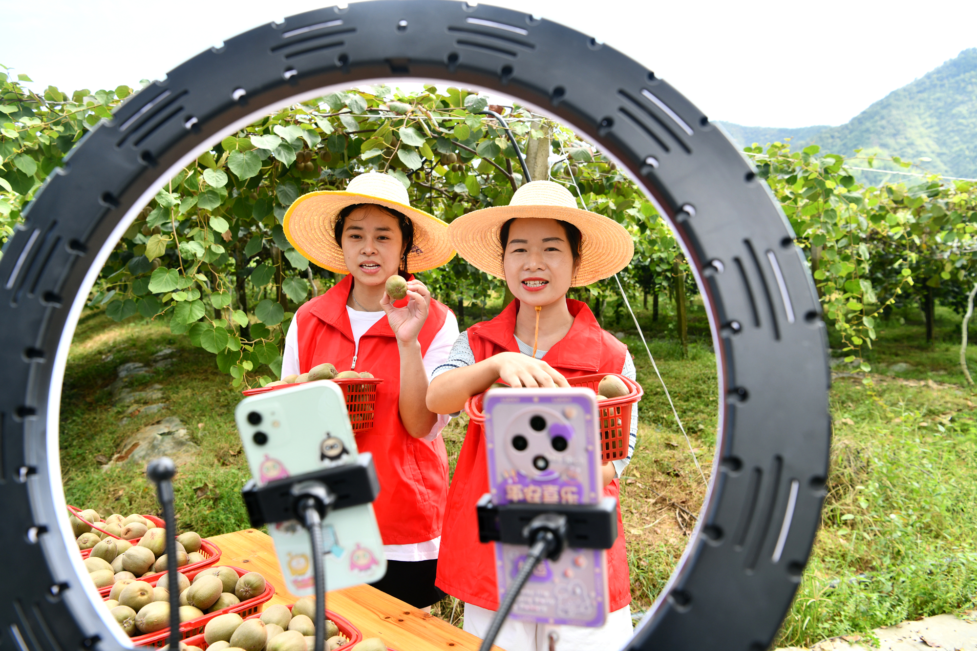 同时,一群身穿红马甲的党员志愿者穿梭在果林间,一边帮助果农采摘成熟的红心猕猴桃,一边面对手机镜头热情推介,通过线上直播助力猕猴桃销售。
