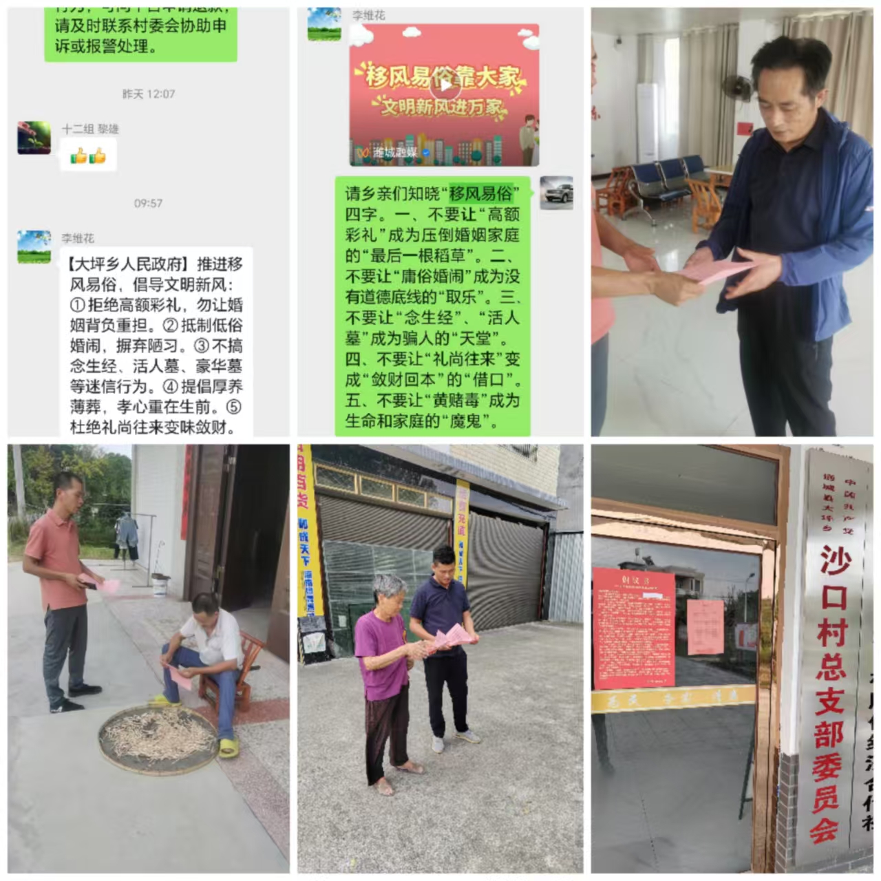 专题会后,宣传动员工作迅速铺开。乡、村两级联动,在各村宣传栏、主要路口等显眼位置张贴移风易俗倡议书500份,让文明倡议抬头可见;村“两委”干部及驻村干部主动下沉一线,逐户上门发放告知书5000份,面对面向群众讲解移风易俗的具体内容和重要意义。同时,充分利用微信群、短信等线上平台,实时推送移风易俗政策要求和典型案例,打破宣传时空限制;通过召开屋场会的形式,与群众围坐交流,倾听意见建议,现场解答疑问,引导群众自觉参与到移风易俗行动中来。