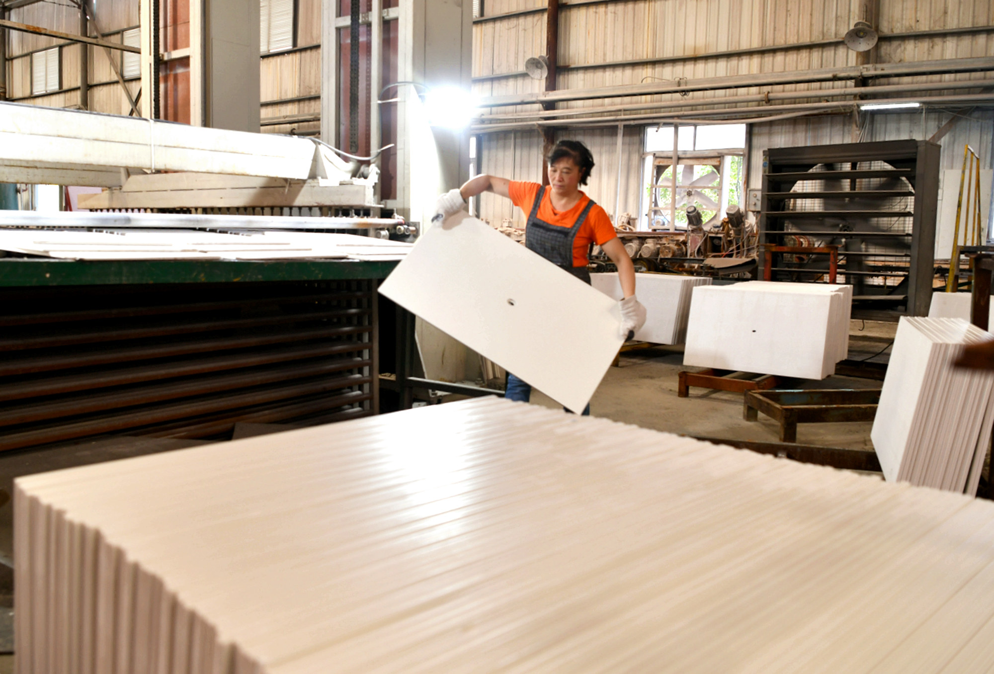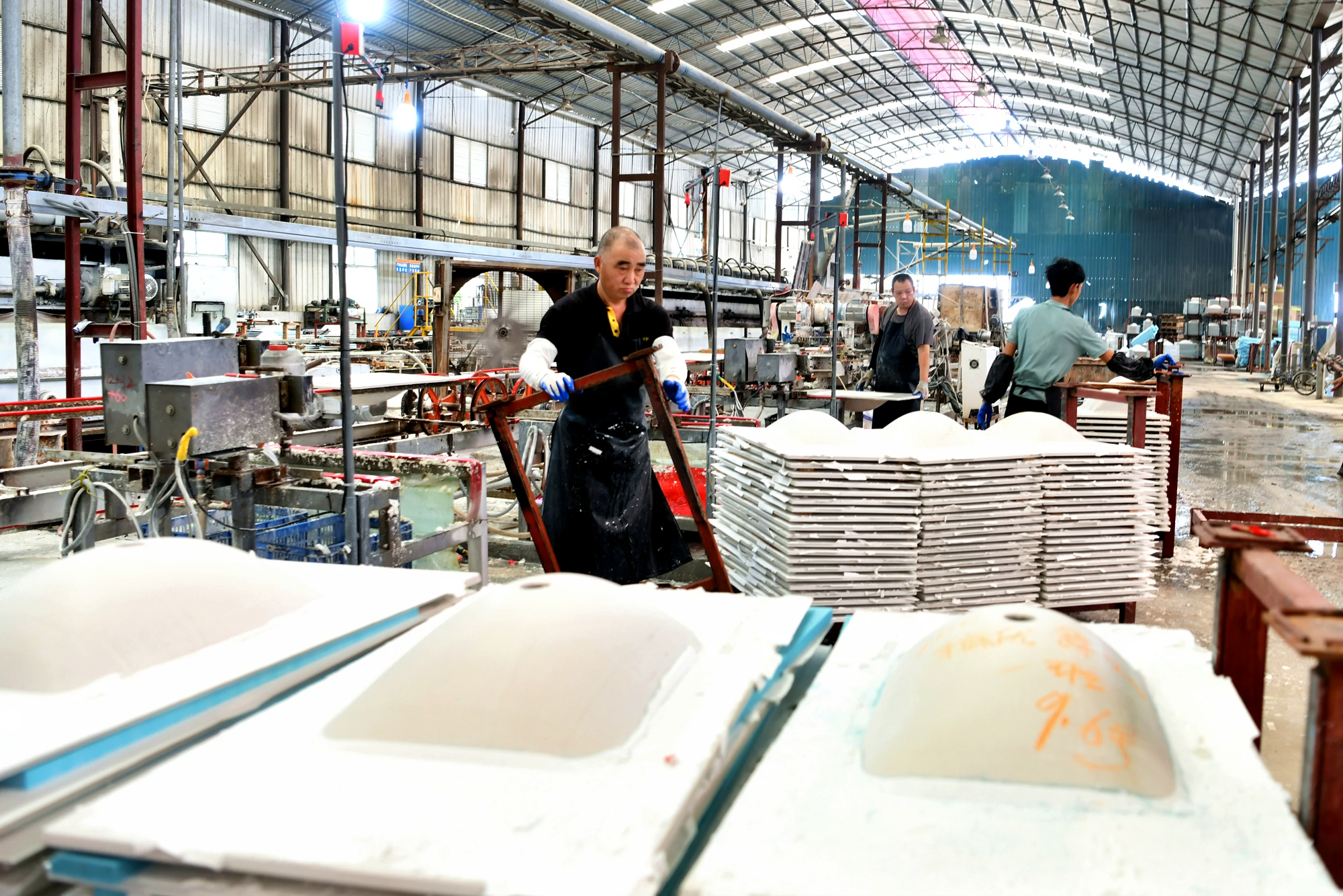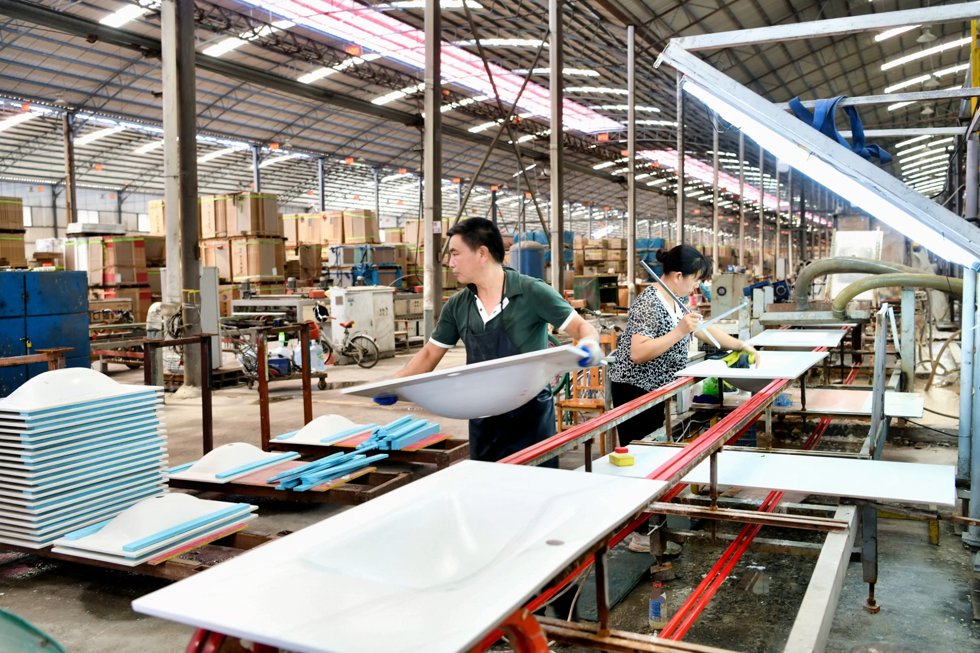 【通讯员 刘建平】9月11日,在通城县经济技术开发区湖北前岩科技有限公司全新卫浴大板生产线正在生产,员工们忙着生产、质检、包装,销往市场。