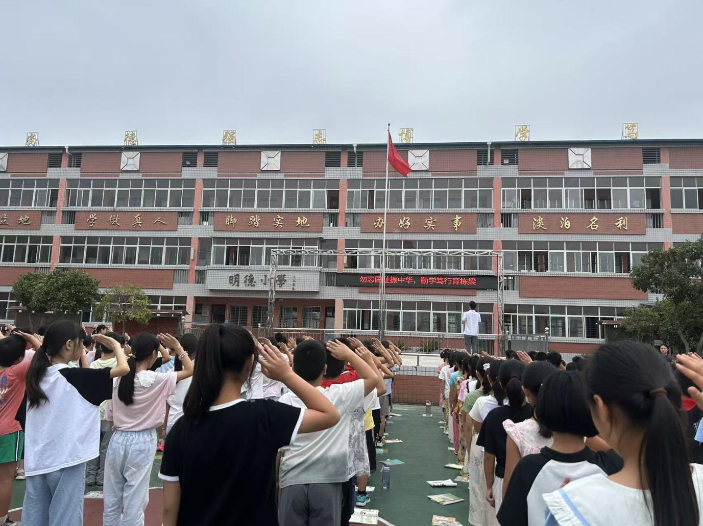 在五星红旗冉冉升起的过程中,少先队员高举右手行队礼,教师行列整齐肃立行注目礼。嘹亮的歌声回荡在校园上空,每一个音符都凝聚着对祖国的崇高敬意与对历史的深切缅怀,庄严氛围中传递出浓厚的爱国情怀。