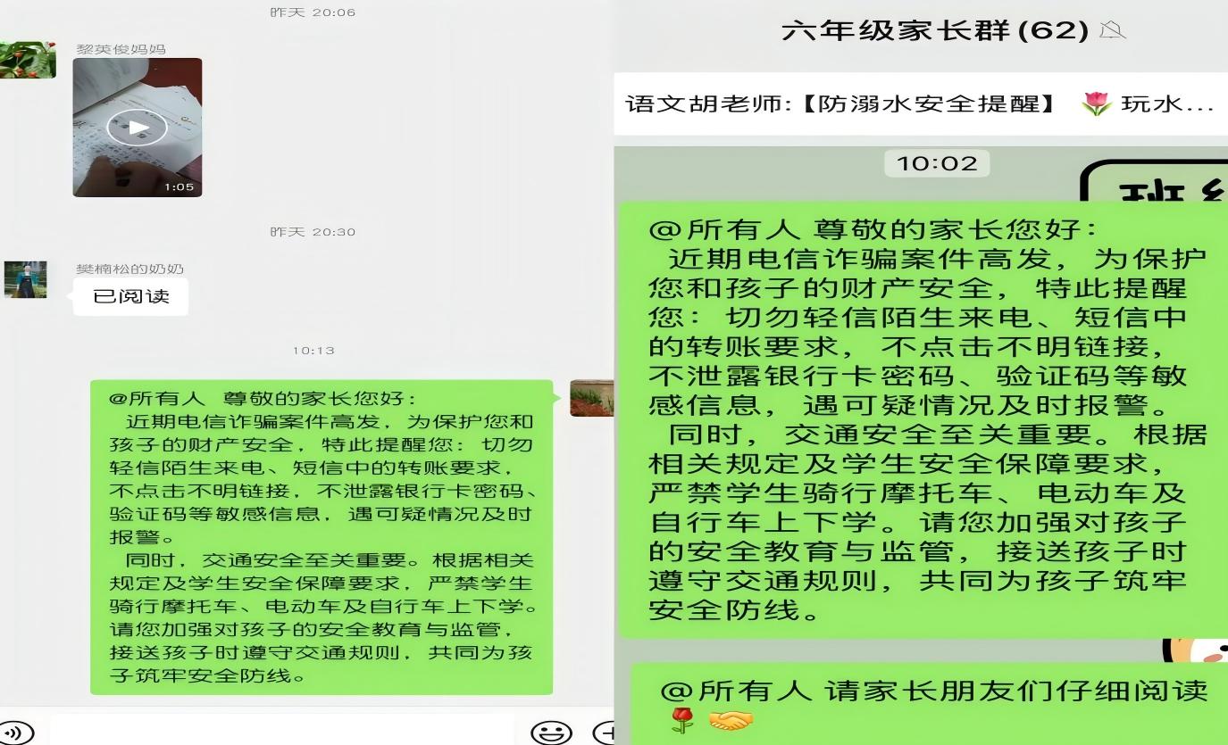 为形成家校共育的安全合力,学校还通过家长群向全体家长发送禁毒反诈安全通知,详细说明毒品与诈骗对家庭的潜在风险,呼吁家长配合学校做好教育引导,共同关注孩子的安全成长,构筑起校园与家庭联动的安全屏障。