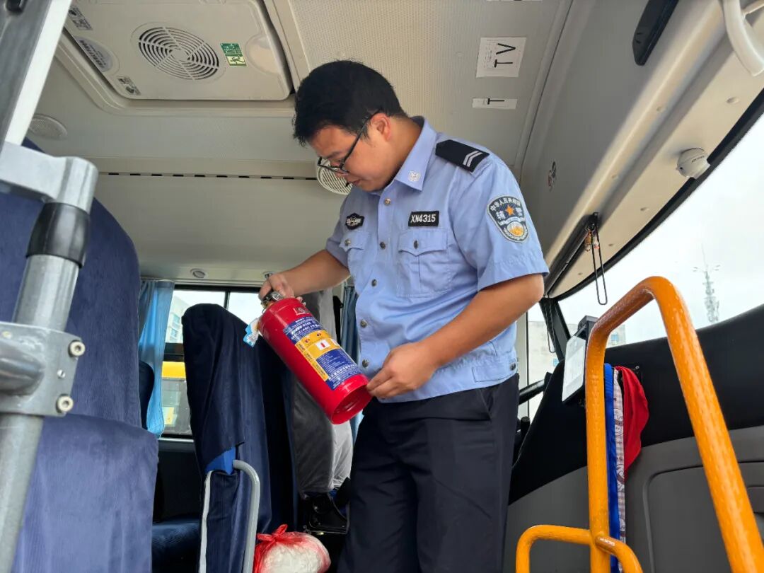 学生的安全出行,是家长最牵挂的事。在校车安全检查时,民警对校车的安全性能、座椅、安全带、灭火器、安全锤、轮胎磨损、雨刮器、灯光、刹车、制动装置以及安全防护设施的配备情况、使用性能进行了核查。同时,对校车驾驶员的驾驶资质进行了检查并提醒校车驾驶员应该做到定期对校车进行安全技术检验,严格按照校车行驶路线、停靠站点接送学生,确保不让校车“带病”上路。