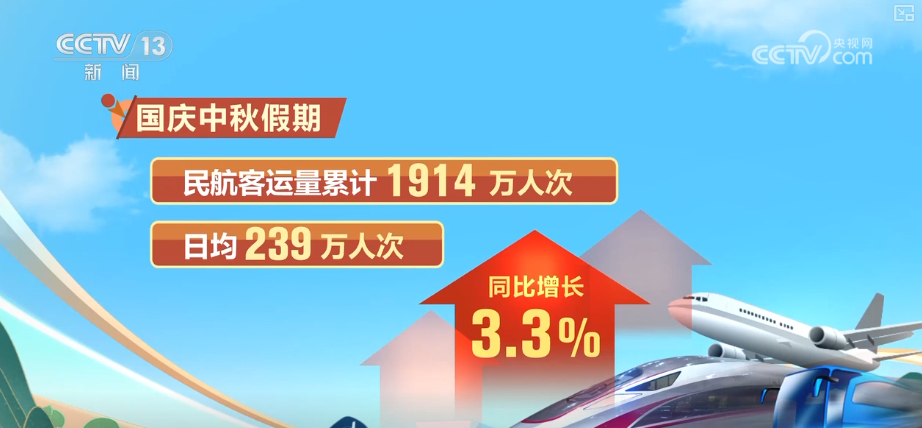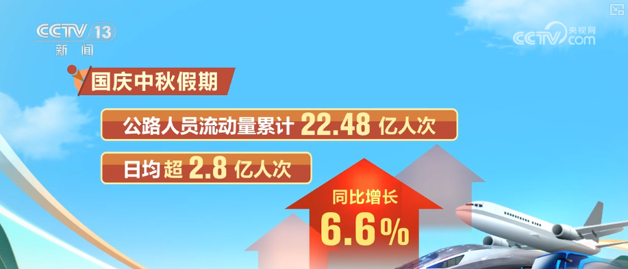 央视网消息:交通运输部10月9日发布的数据显示,刚刚过去的这个国庆中秋假期期间,全社会跨区域人员流动量累计24.33亿人次,日均3.04亿人次,同比增长6.3%。
