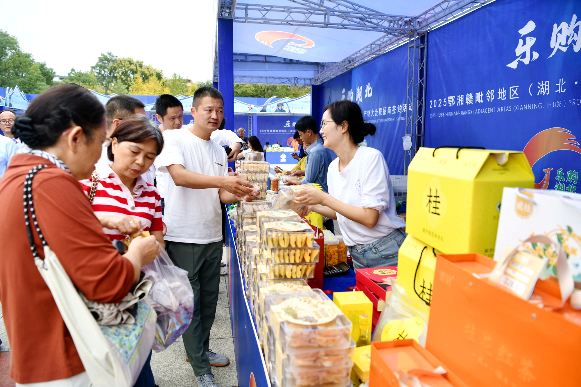【全媒体记者 刘康 骆博 通讯员 罗冰友 蒋维】10月17日,2025鄂湘赣毗邻地区(湖北·咸宁)产销大会暨招商签约活动在通城县银山广场拉开帷幕,一场以“鄂湘赣产销融合,电商赋能促消费”为主题的三省特产“大集”火热开市,各种各样的特色好物与热闹的互动氛围,吸引了大批群众与采购商前来 “赶场”,共赴这场跨省界的消费盛宴。