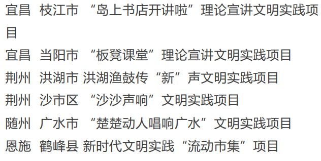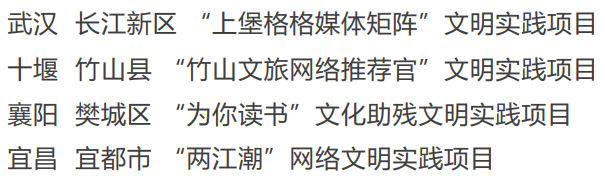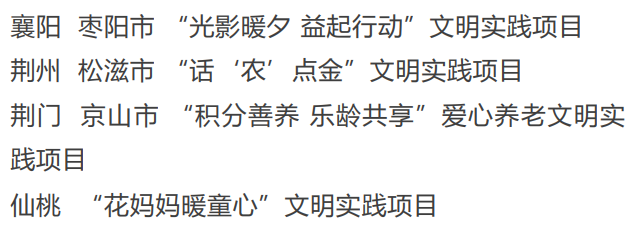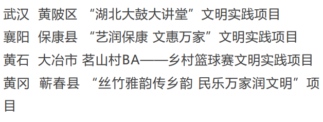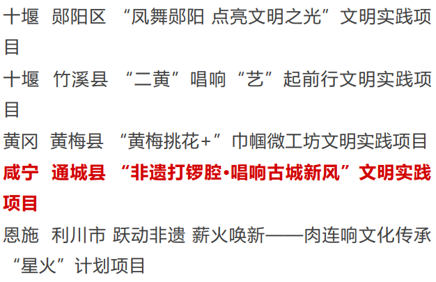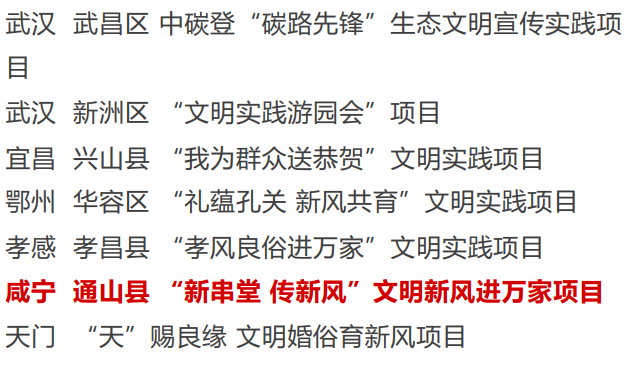 咸宁2个文明实践项目被纳入湖北省品牌项目库 2025-11-13 15:00 0 文 明 实 践 为进一步发挥文明实践项目对建强用好新时代文明实践中心的支撑作用,推动文明实践高质量发展,今年来,各地文明实践中心精心培育,市州文明办加强指导,经推荐遴选, 46个项目参加10月16日举办的“文明实践 情满荆楚”——2025年全省新时代文明实践项目线上交流展示活动,生动呈现如何通过文明实践项目实施,常态长效推动党的创新理论“飞入寻常百姓家”,丰富群众精神文化生活,促进乡风文明建设等,集中展示了各地文明实践项目培育成果。 经专家评议、审核研究,30个管理规范、实施成效明显、社会影响广泛的文明实践项目被纳入省级品牌项目库(名单附后)。 下一步,将通过资金扶持、总结提升、宣传推介等措施,对品牌项目持续跟踪问效,切实发挥其示范引领作用,带动全省文明实践项目培育工作迈上新台阶,不断擦亮“文明实践 情满荆楚”工作品牌。 2025年湖北省新时代文明实践 品牌项目名单 (共30个) 一 理论政策宣讲类(6个) 二 文化文艺服务类(4个) 三 文化传承保护类(5个) 四 文明风尚培育类(7个) 五 网络文明建设类(4个) 六 民生服务类(4个) 来源:文明湖北