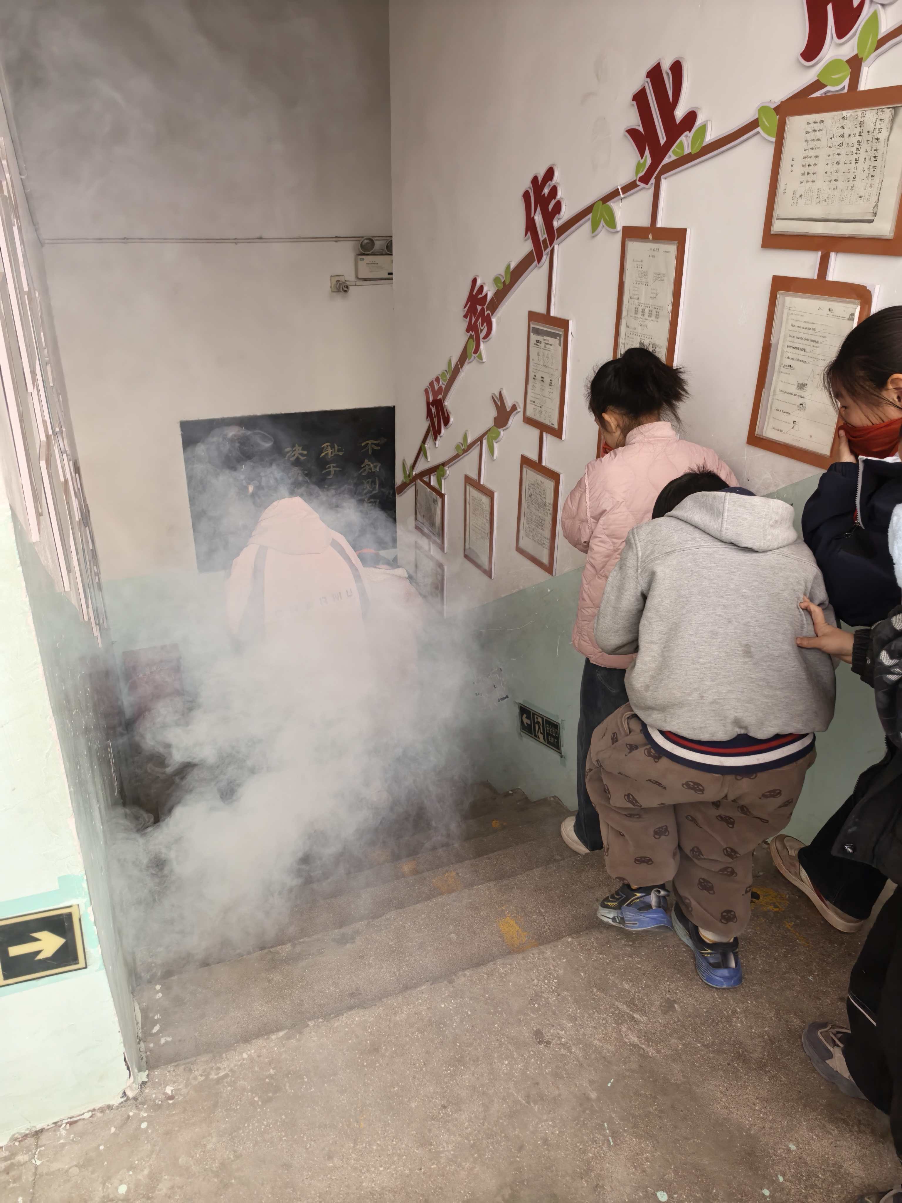 随着模拟火灾警报声响起,演练正式开始。现场浓烟弥漫,模拟真实火场情境。全体师生在疏散引导员的指挥下,迅速用湿毛巾捂住口鼻,弯腰低姿,按照预设逃生路线,快速、有序地撤离至指定安全区域。疏散过程中,大家严格遵守逃生规则,不慌乱、不拥挤,展现了良好的应急素养。