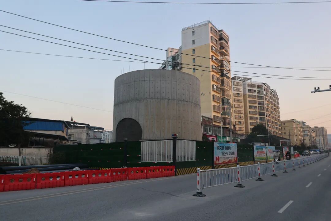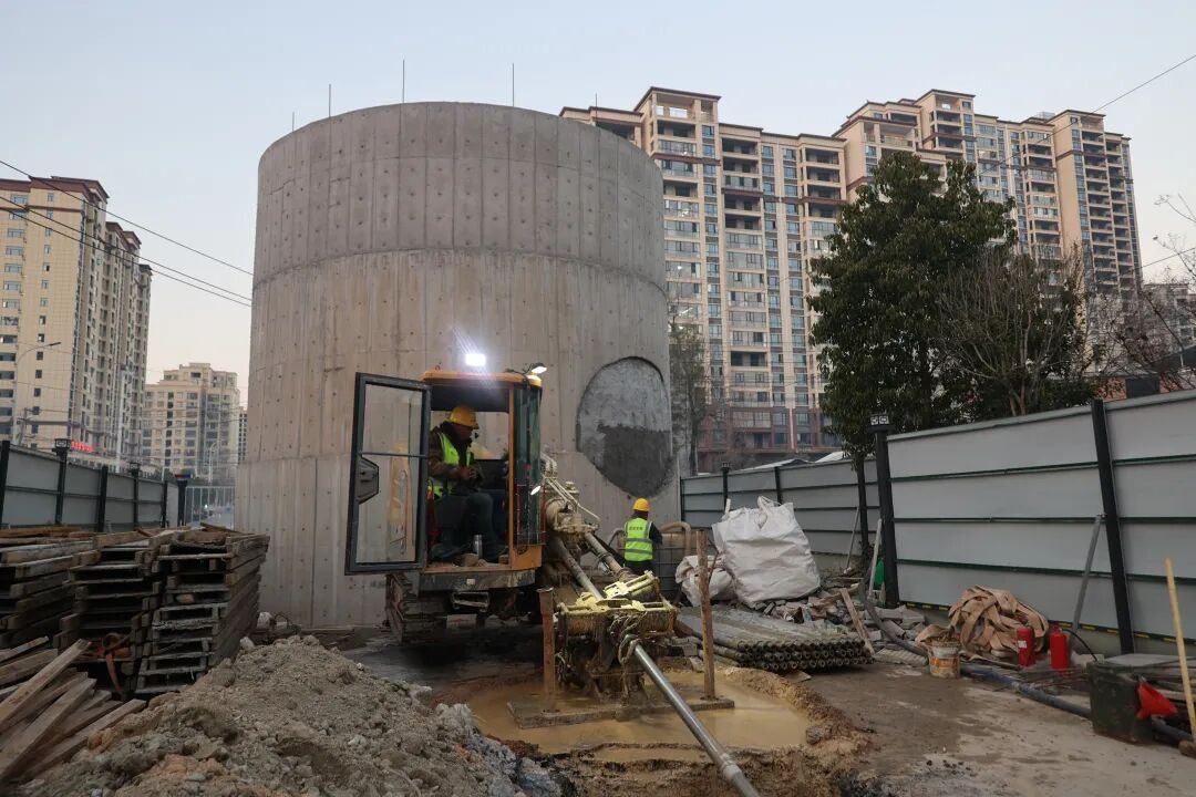 为此,施工方科学采用 “高压旋喷止水帷幕 + 沉井” 技术,群众所见的“混凝土墩柱”,学名为下沉井。在施工过程中,工人们一边挖井内的土,一边让下沉井慢慢往下沉。待下沉井下沉至预设深度后,再用专业机械在地下掘进 “隧道”,并同步铺设雨水管道,路上车辆、行人可照常通行。待雨水管道与下游连通后,实现雨水分流排放,整个施工过程无需大面积开挖路面,待工程全面竣工后,下沉井将与路面齐平,道路也将恢复原貌。
