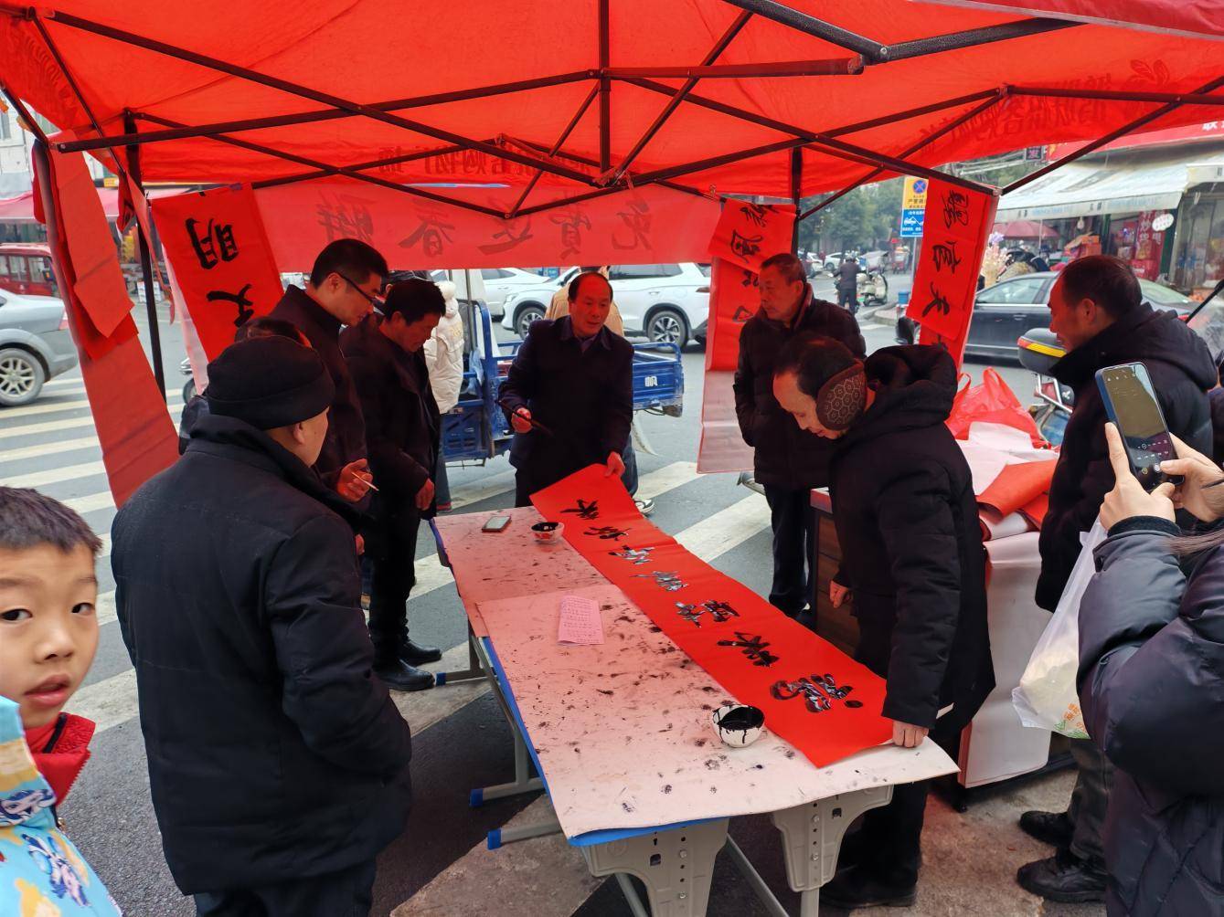 活动现场暖意融融、墨香四溢。鲜红的春联纸整齐铺展,镇内书法爱好者与文化志愿者凝神提笔、挥毫泼墨,楷书端庄秀丽、行书流畅飘逸、隶书古朴典雅,一副副对仗工整、寓意吉祥的春联跃然纸上。既有“骏马迎春开胜景,春风送暖入千家”的马年吉语,也有“家和万事兴,国泰民安康”的质朴祝愿,更融入移风易俗、清洁家园等内容,让传统春联更具新意与温度。