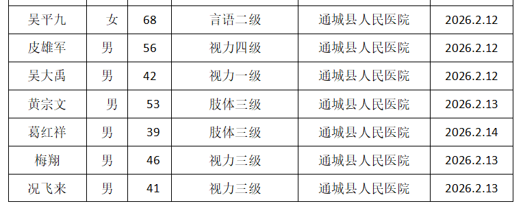 公示时间为: 2026年2月14日~ 2026 年2月27日(5个工作日)。请对照《残疾人残疾分类和分级》(GB/T26341-2010),如认为公示对象不符合残疾标准,或评定过程存在弄虚作假行为,可在公示期间向通城县残联反映。联系电话:0715-4338773 联系地址:通城县隽水镇城西新区县残联办公室(邮编437400)。