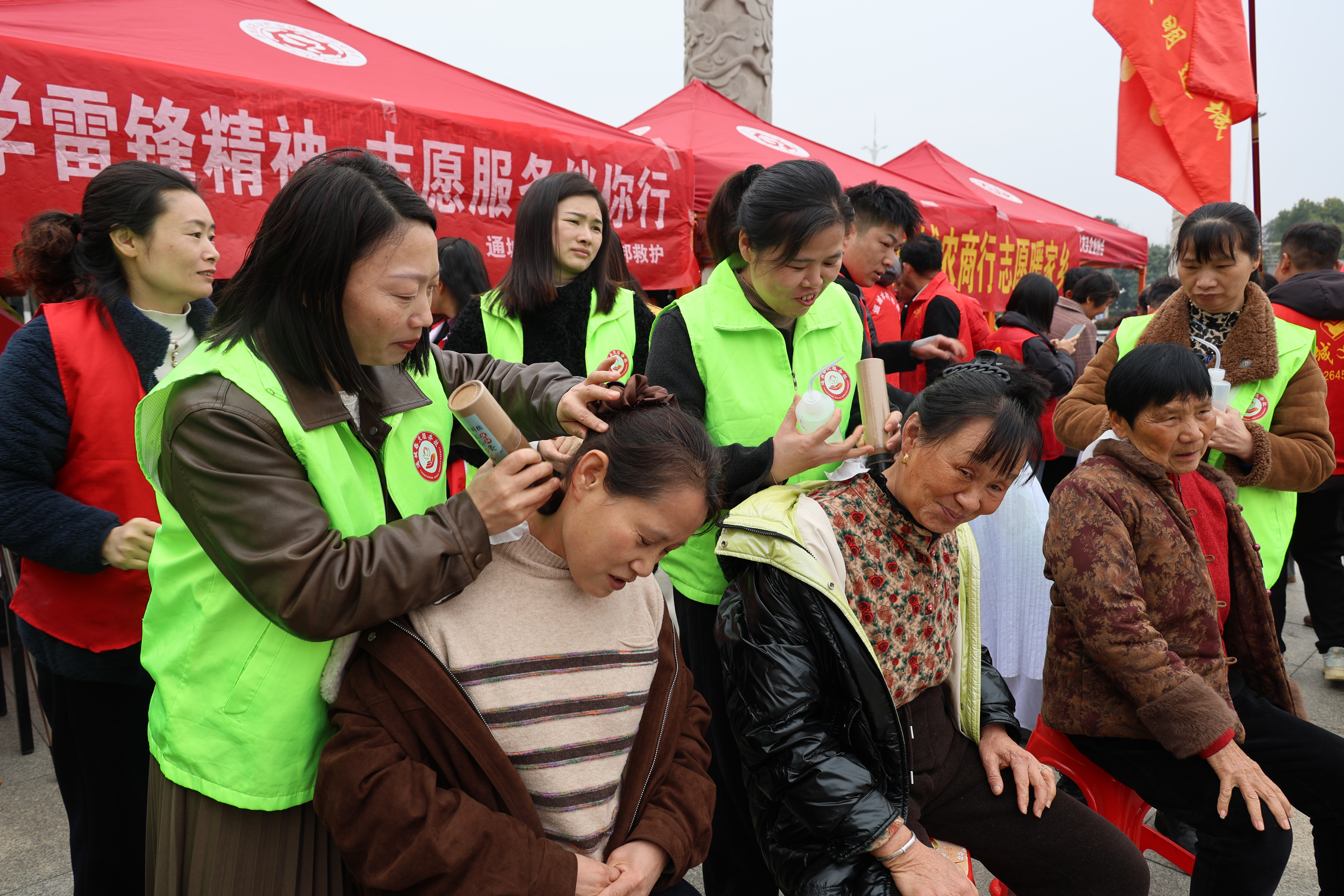 生活便民服务区散发着浓浓的“烟火气”。县义工协会联合众邦救护队设立的义务理发点,理发师一刻不停,为群众修剪出利落发型;针对老年群体的“智能手机课堂”座无虚席,志愿者一对一教老人使用微信视频、预约挂号,帮助跨越“数字鸿沟”。