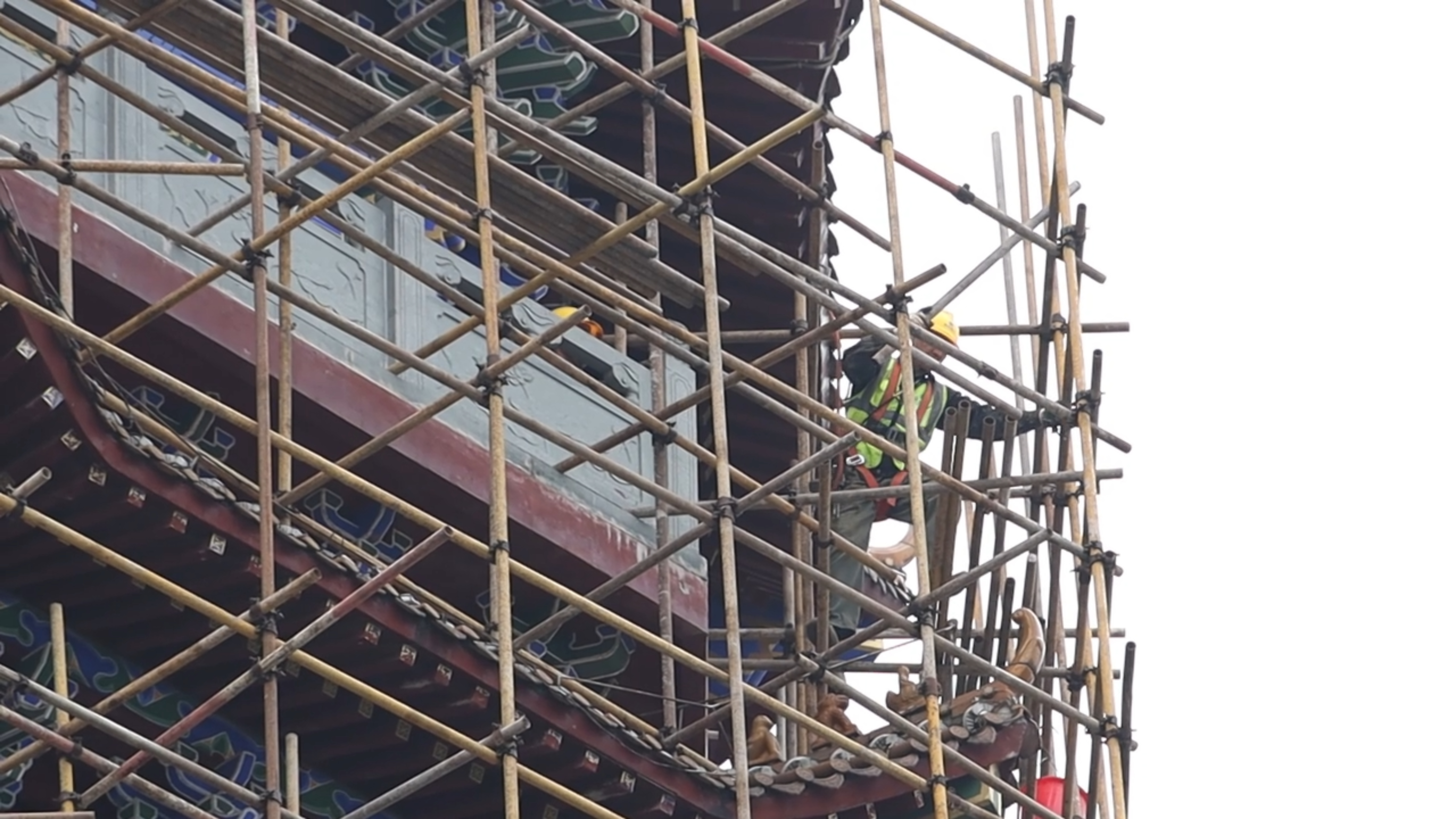 4月14日,在项目建设现场,工人们在安全措施的保障下,进行脚手架搭设作业。