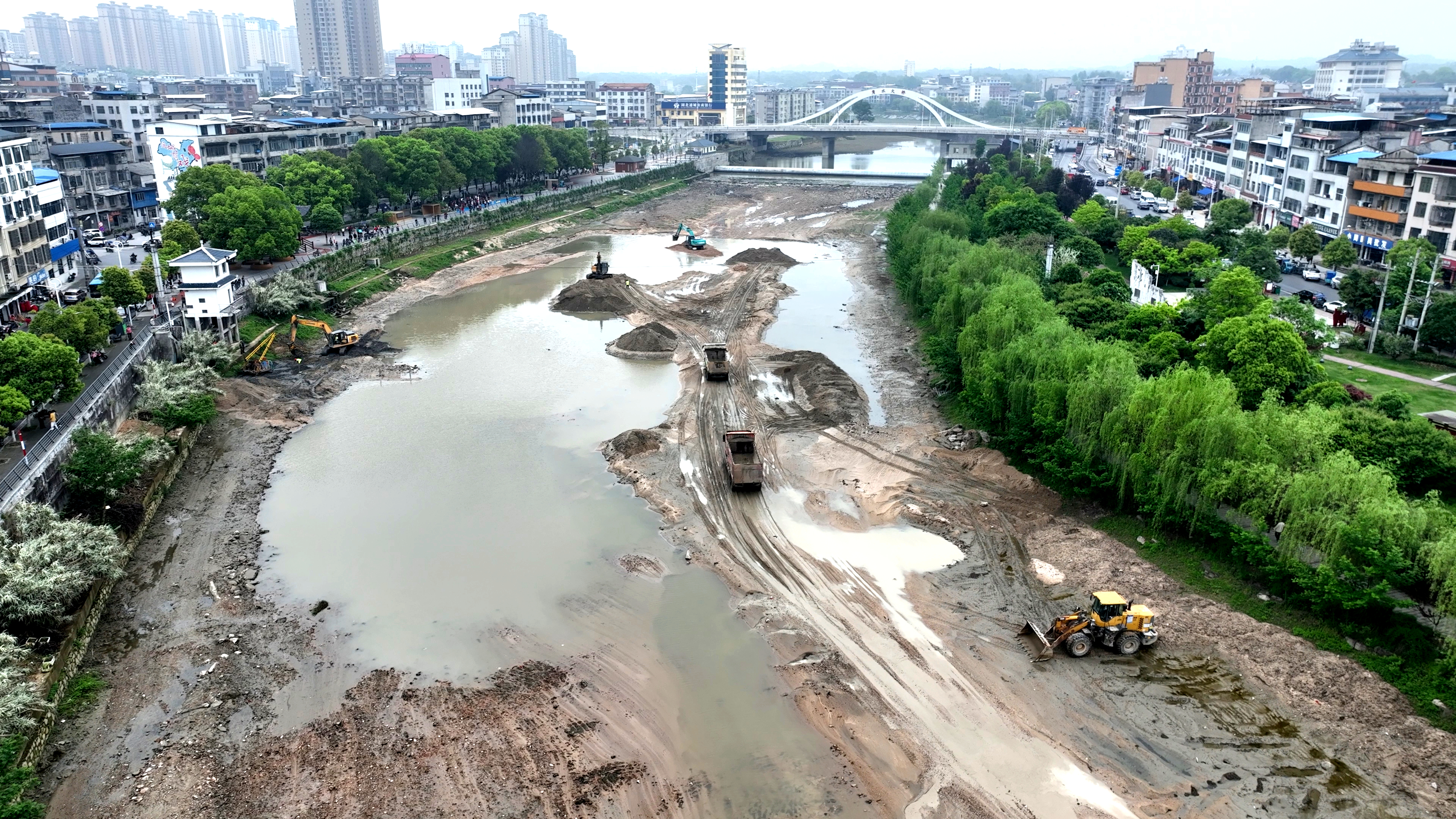 4月17日,在柳堤路隽水河畔,多台大型挖掘机伸长铁臂,正有序清理河道底部沉积多年的淤泥。一斗斗黑褐色的淤泥被挖出河床,装入等候在旁的大型运输车辆。