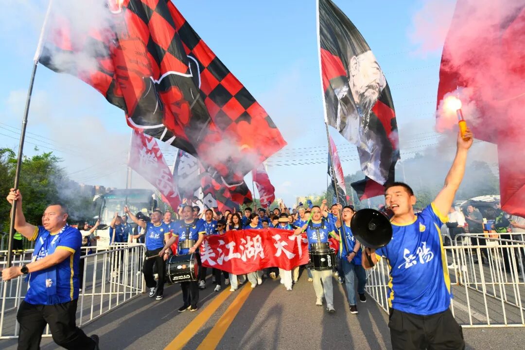 来自湖南岳阳的300名球迷专程赶来,与咸宁啦啦队现场“斗歌斗舞”。岳州军球迷协会志愿部的卢先生竖起大拇指:“下次咸宁朋友去岳阳,我们一定好好招待!”