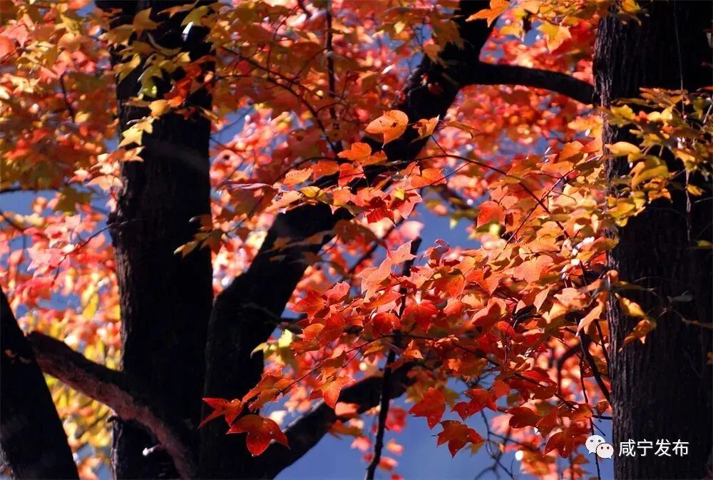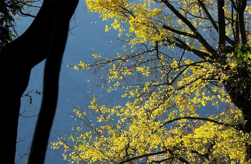 沿着山路拾级而上,天气晴朗,空气清透,光线的折角都分外明确,片片金黄透过林间的缝隙闪耀在枝头,除了鸟语、泉声、落叶声,听不到任何喧哗,更无一丝尘埃。