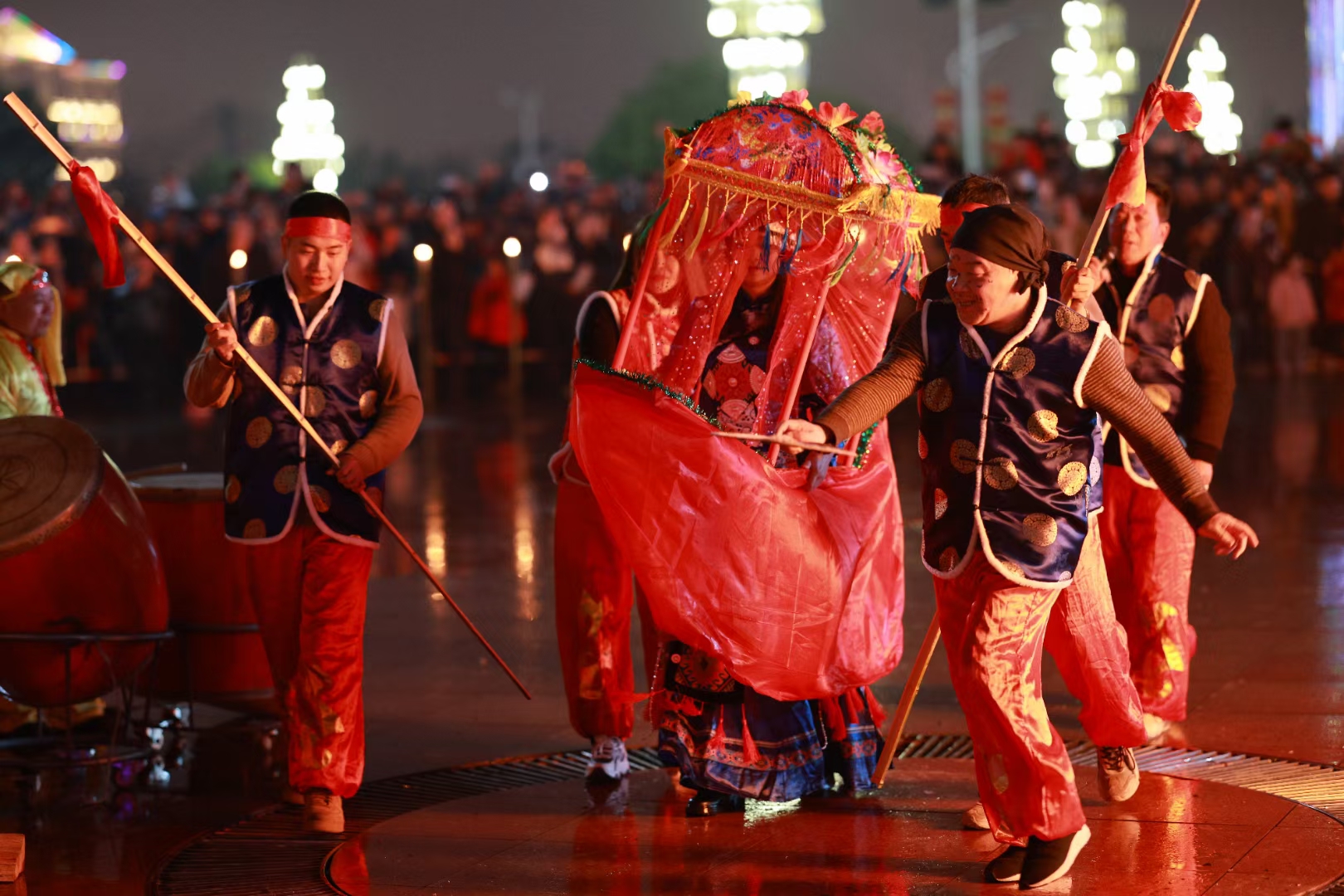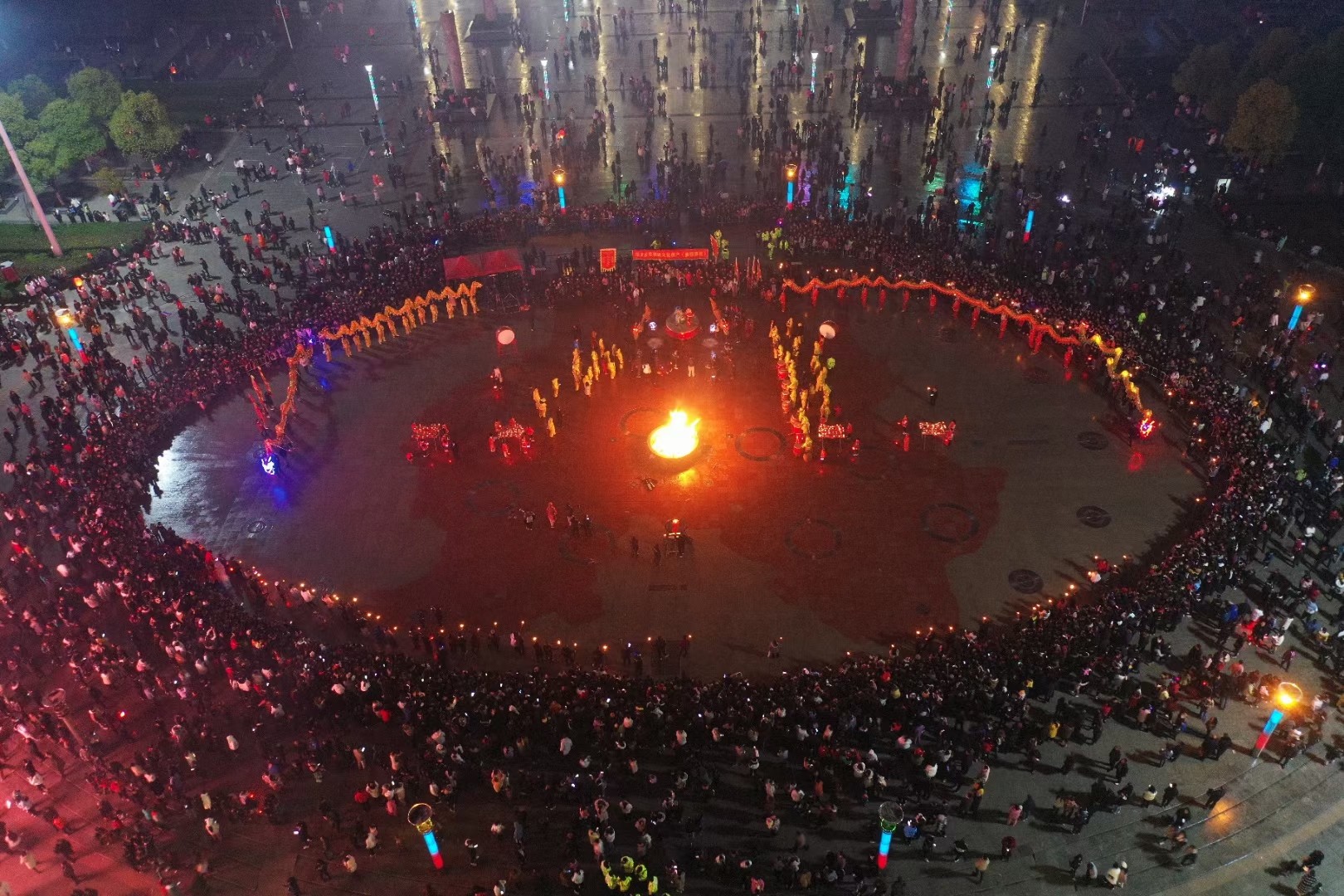 除了绚丽多彩的烟花秀,来自通城县石南镇的村民们还将当地最具特色的“赛锣赛亮”民俗表演带到了现场。“赛锣赛亮”是石南镇花崙、赛公、梅港一带流传下来的传统闹元宵习俗,活动兴起于南宋时期,距今已有八百多年的历史,这一传统习俗被列入湖北省非物质文化遗产名录。表演现场,村民们围着篝火,赛锣鼓、赛灯火,贺新春、闹元宵,市民和游客也沉浸其中,现场成了一片欢乐的海洋。