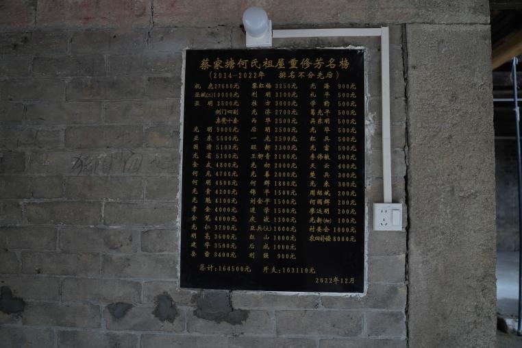 27600元、10000元、9000元、2000元、500元……在57户数额不等的共同努力下共筹164500元,用于蔡家塘祖屋重修。房屋中间的戏台、两旁的跑马楼、琳琅满目的石窗和木窗、抗住历史变幻的屋顶梁架,祖屋的重修不仅仅是普通房子的“装修”,更是屋以溢彩,团聚亲友之地方,事以齐成,和睦乡邻之典范。