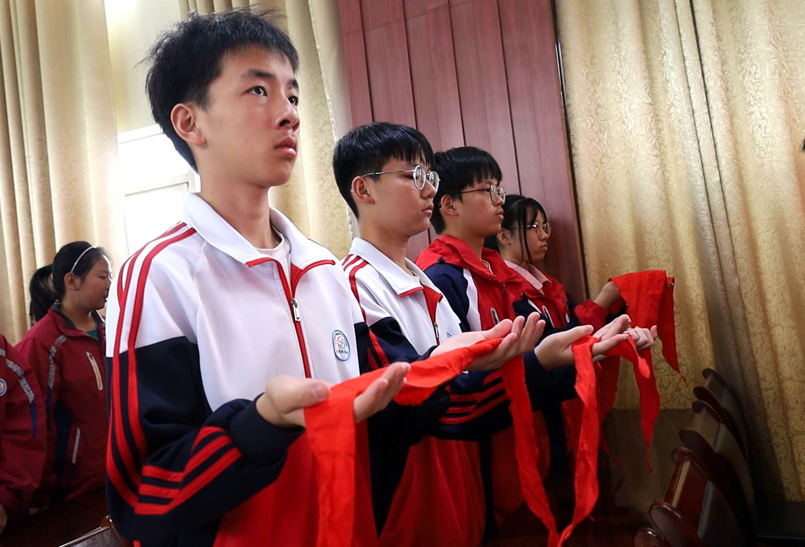 随后,举行新团员入团仪式。各学校分管负责人为新团员代表佩戴团徽。新团员代表面向团旗,举起右手,握紧拳头,跟着领颂人庄严宣誓。