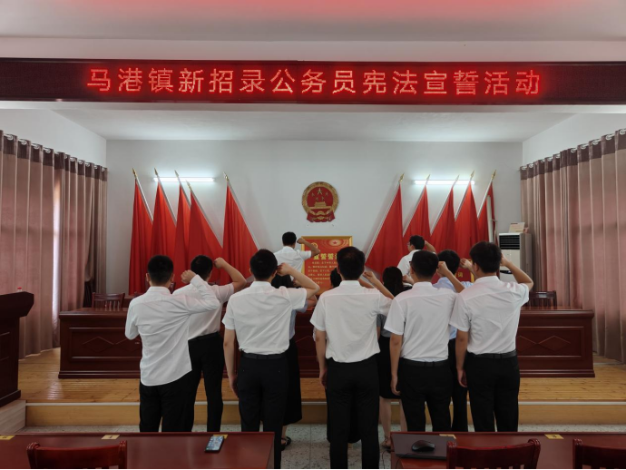 仪式上,马港镇10名年轻公务员在镇党委副书记乐文刚同志的带领下,面对国徽,高举右拳,庄严宣誓。