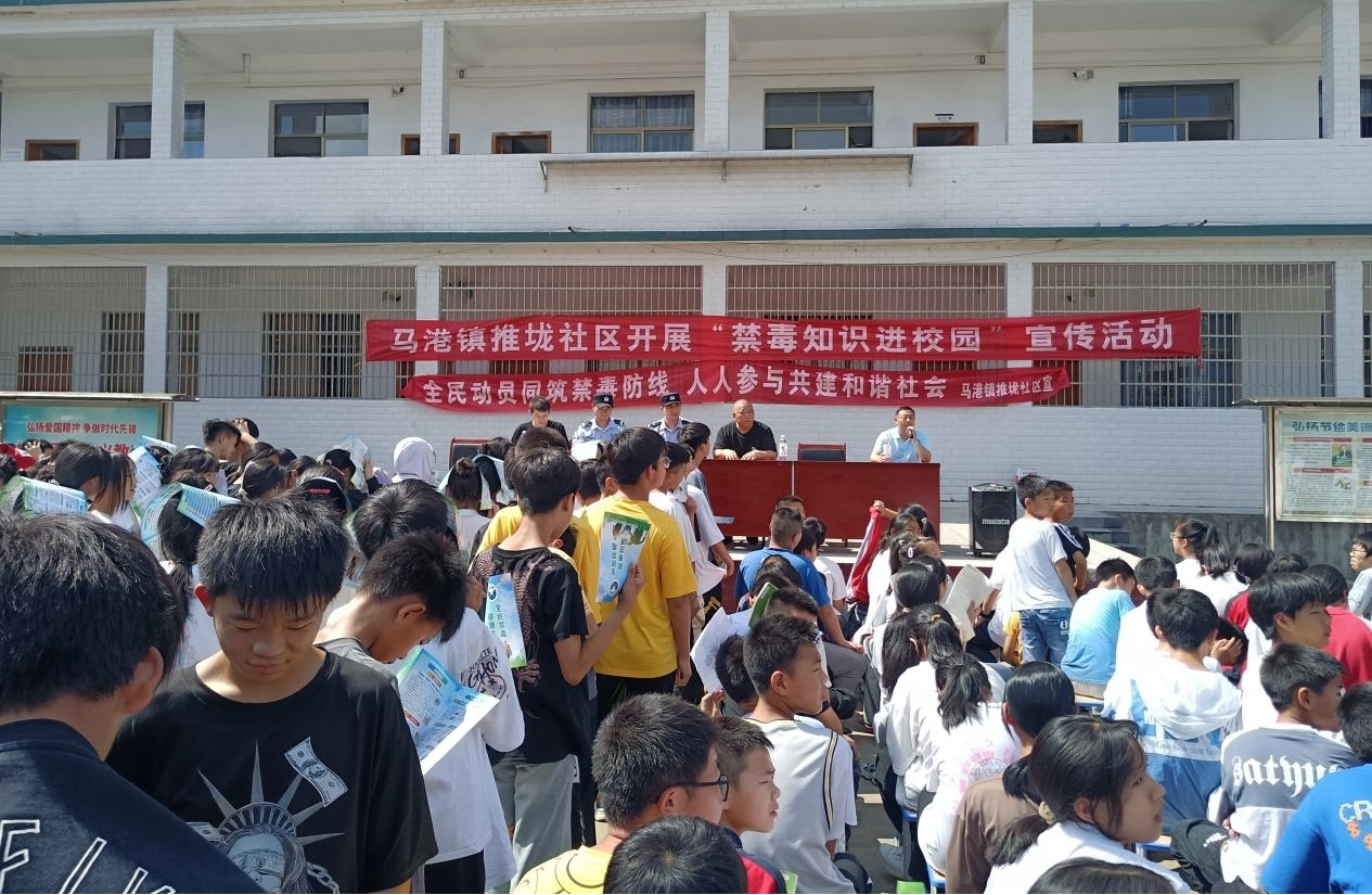 在第36个国际禁毒日来临之际,6月26日上午,马港镇派出所、马港镇司法所、马港镇中心戒毒康复社区联合马港镇推垅社区,走进马港中学,开展了一场以“全民动员同筑禁毒防线 人人参与共建和谐社会”为主题的宣传教育活动。政法干警、学生、网格员及青年志愿者等三百余人参加此次活动。