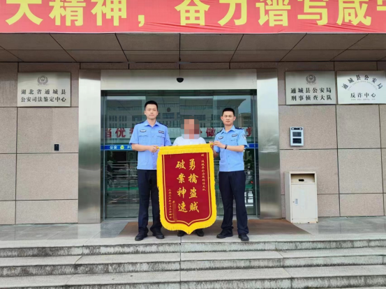 7月24日,市民廖先生将一面印有“勇擒盗贼,破案神速”的锦旗送到民警手中,感谢民警快速破案,为其挽回全部损失。