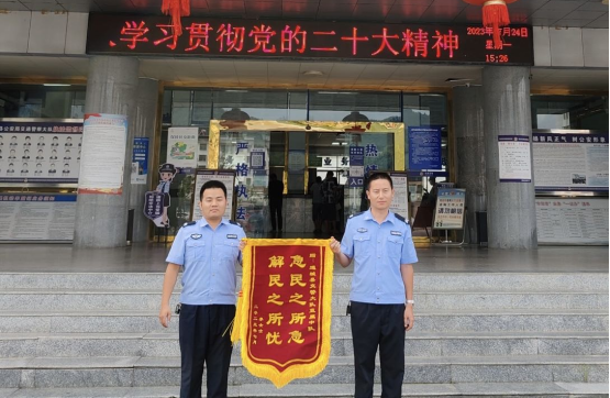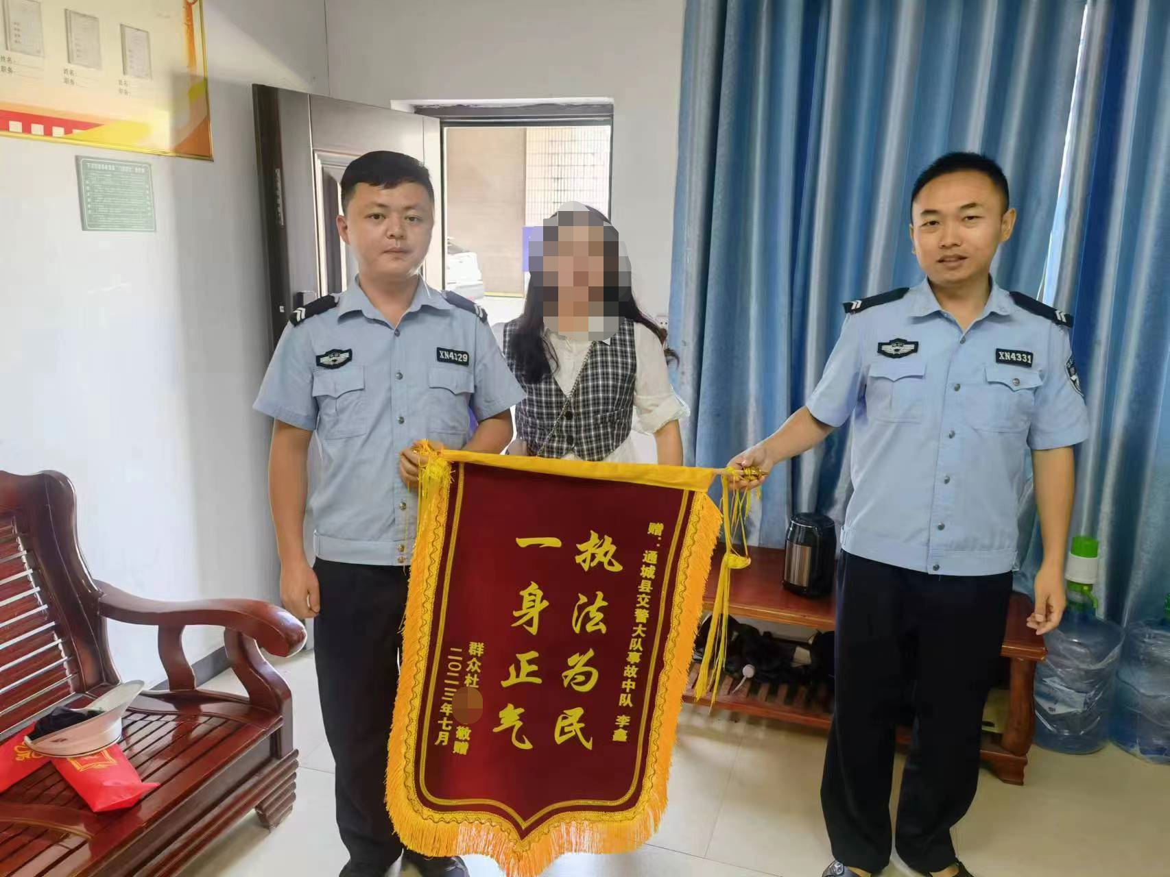 7月24日,市民杜女士将印有“一身正气,执法为民”锦旗送到民警手中,感谢民警为其找到肇事者,挽回其损失。