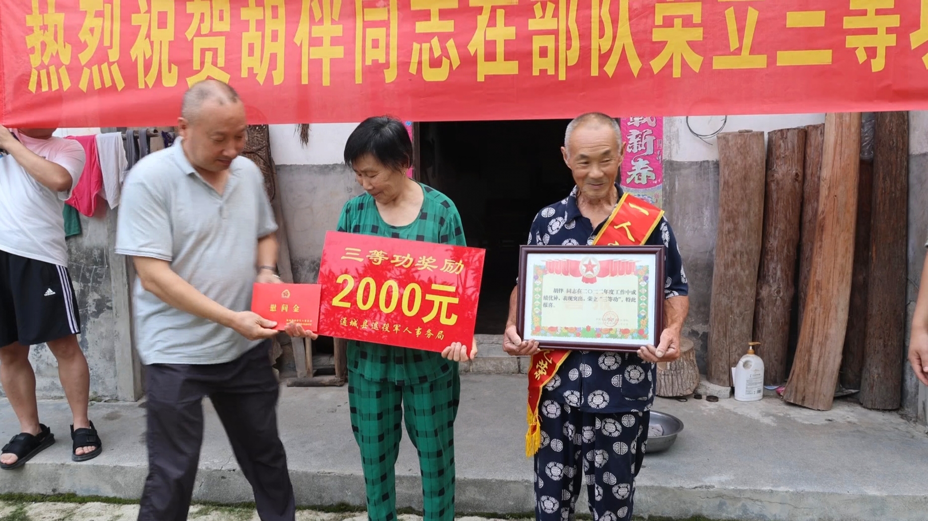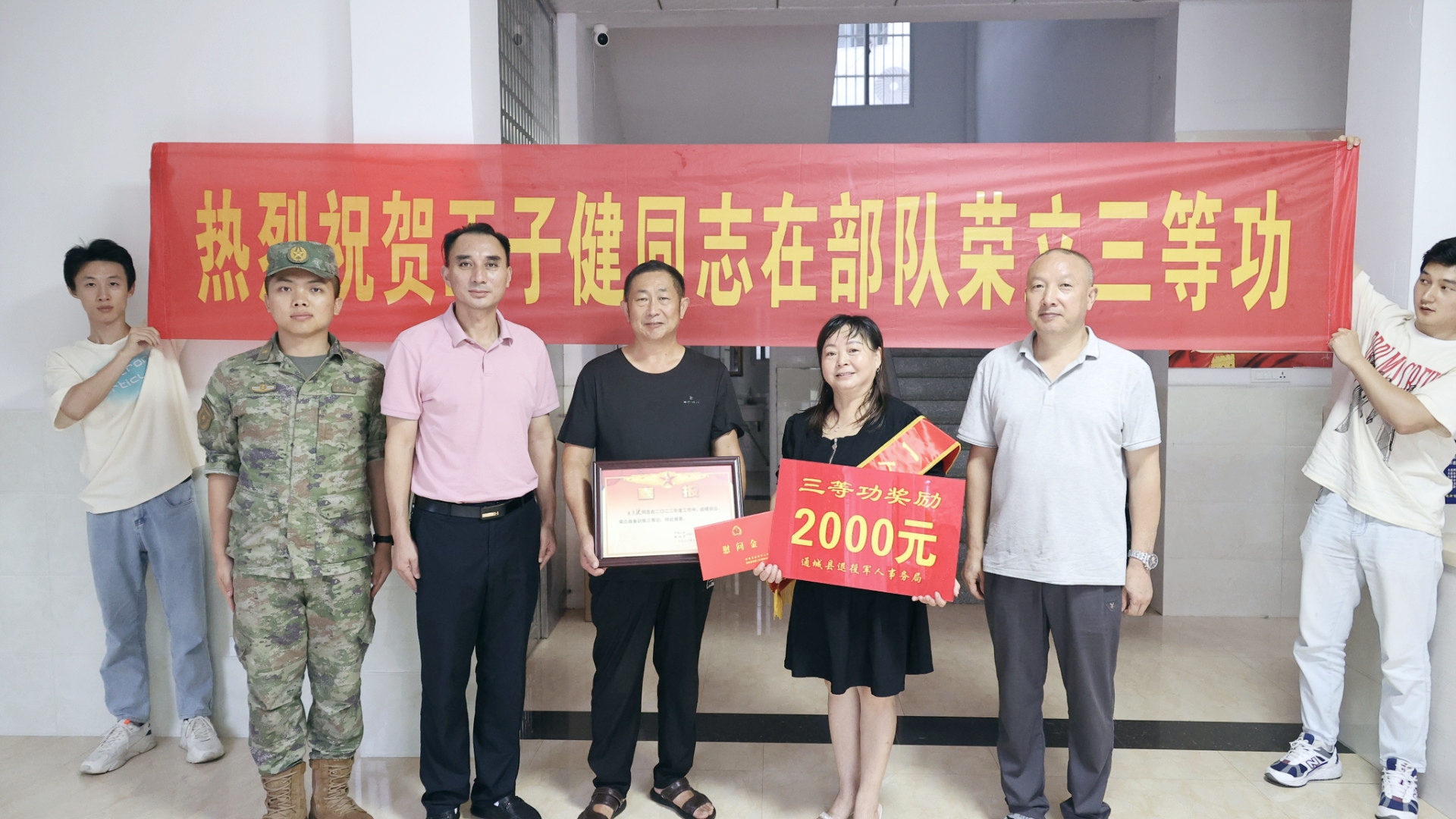 7月25日,通城县人武部联合通城县退役军人事务局为7名荣立三等功的现役军人家庭集中送喜报,向他们送去党和政府对军人家属的关怀和问候。