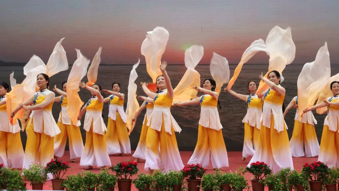 比赛现场,参赛队伍接连登场演出,队员们精神饱满,神采飞扬,他们身着色彩鲜艳的服装,踏着优美的舞步,伴随着动感的音乐旋律翩翩起舞,动作轻柔舒缓,队形变化有序,每一支舞蹈都展示了新时代群众昂扬向上、奋发图强的精神风貌。