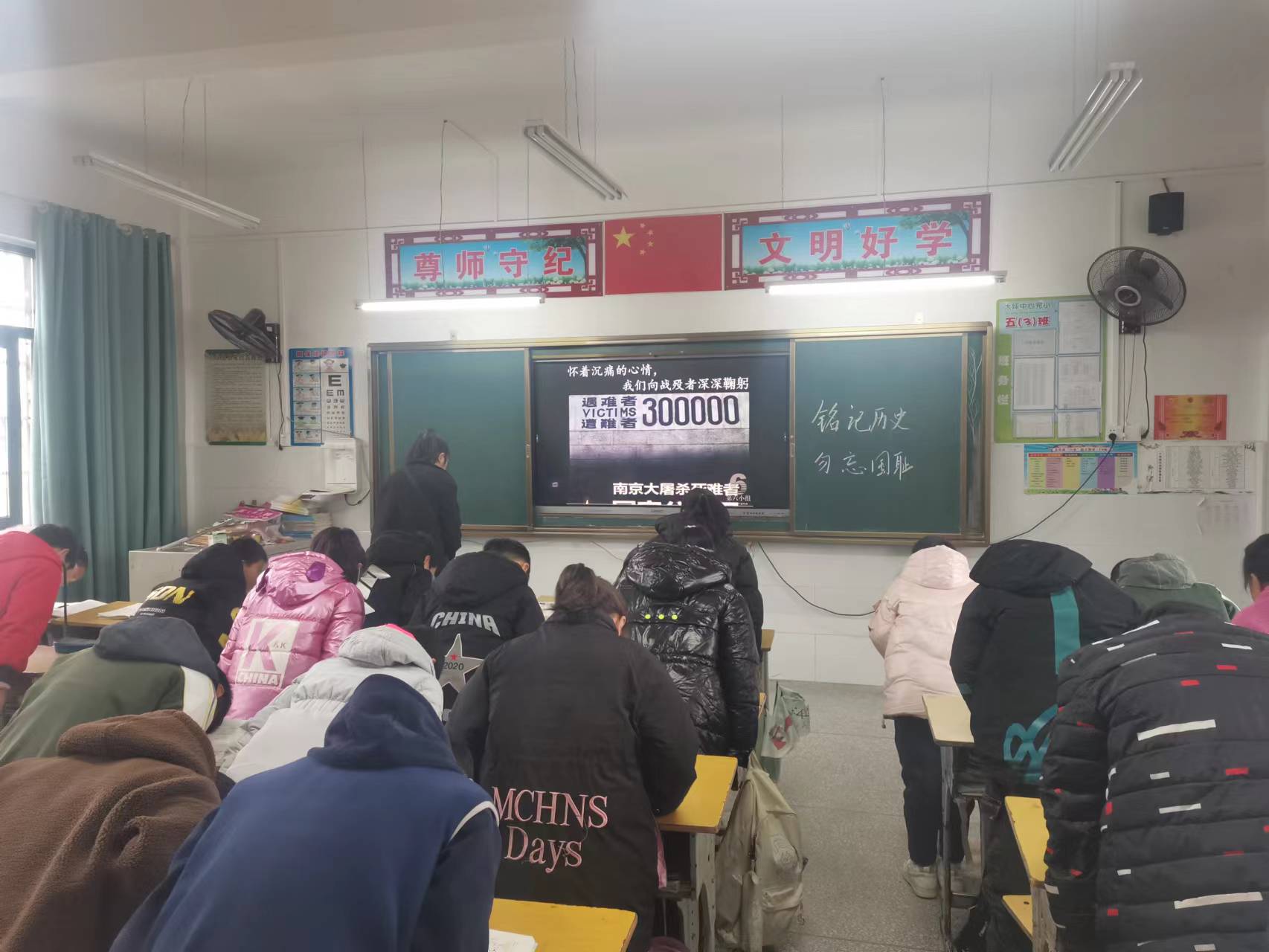 升旗仪式上,学校少工委通过升国旗、降半旗及默哀的方式对逝者志哀;通过“不能忘却的记忆”国旗下的讲话带领大家回顾南京大屠杀的历史,诠释了设立“国家公祭日”的意义。主题班会课上,各班利用视频、PPT等,再现南京大屠杀那一段段让人潸然泪下的惨痛而屈辱的历史,并组织学生进行唱红色歌曲、讲革命故事、颂革命精神等活动。