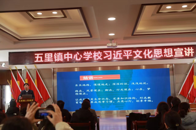 宣讲会以《深刻把握习近平文化思想的核心要义———习近平新时代中国特色社会主义思想之文化思想》为主题,授课讲师围绕“文化是民族之魂、坚定文化自信、如何做好新时代合格教师”以鲜活的案例、翔实的资料、生动的语言、深入浅出地给大家进行了宣讲。希望广大教职工要坚定文化自信,秉持开放包容,坚持守正创新,坚持不懈用习近平文化思想凝心铸魂,在真学真懂真信真用、深化内化转化上下功夫。在教育教学上,要以学生为中心,争做现代好教师,不断巩固全党全国各族人民团结奋斗的共同思想基础,不断提升国家文化软实力和中华文化影响力,为全面建设社会主义现代化国家、全面推进中华民族伟大复兴提供坚强思想保证、强大精神力量和有利文化条件。