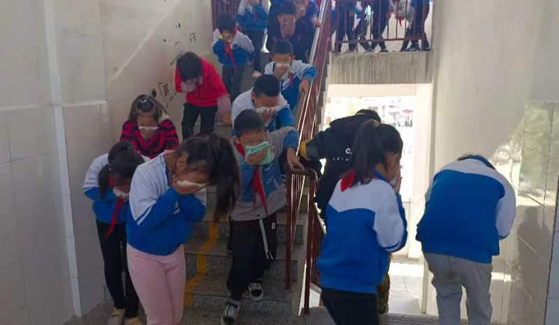 随着消防警报的响起,消防应急演练活动拉开了帷幕,各班教师严格按照学校制定的安全疏散应急预案,进入各自岗位,引导学生们按照指定路线有序逃生,学生们则一个个弯腰低头,用毛巾捂住口鼻,迅速撤离到校园内空旷地带,整个演练过程井然有序。