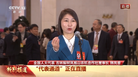 全国人大代表、吉林梨树凤凰山农机合作社理事长韩凤香接受采访。