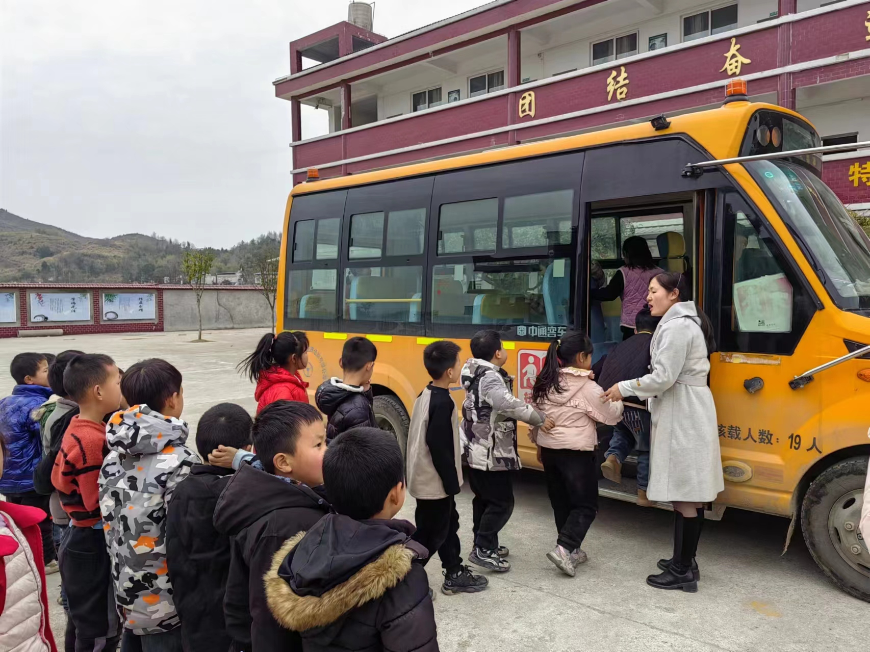 演练开始前,老师安排好学生人数,并强调演练时的注意事项。学生们有序排队、上车,一人一座,校车司机叮嘱并监督学生系好安全带。