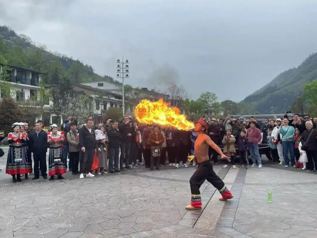 在瑶望千年广场,拍打舞、瑶族歌舞、特技喷火等节目轮番上演,现场观众叫好声、欢呼声不断。演员们用他们的方式带给大家欢声笑语。工作人员在现场维持秩序,眼观六路耳听八方,让市民游客安心观演,导游小姐姐们始终带着甜美的微笑为大家服务。景区门票虽然免费,但服务却没有打折。