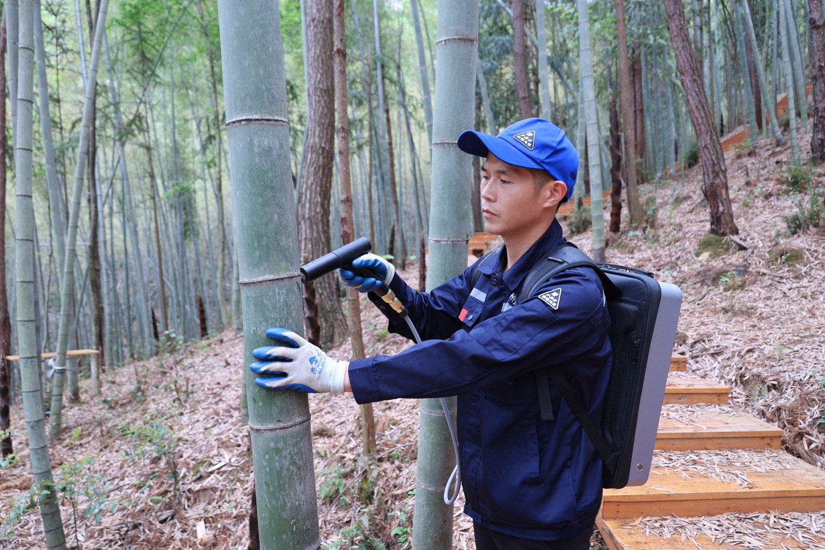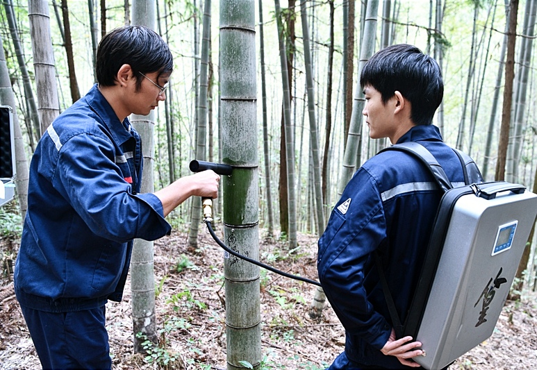 4月10日,记者来到位于通城县药姑林场的一处楠竹林,10多位工作人员正忙着在竹子上打洞,取出琥珀色的酒液,竹林中酒香四溢。原来,这片竹林是隽州篁酒业建设的种酒体验基地,目前,竹林中的酒已经到了采收的阶段。