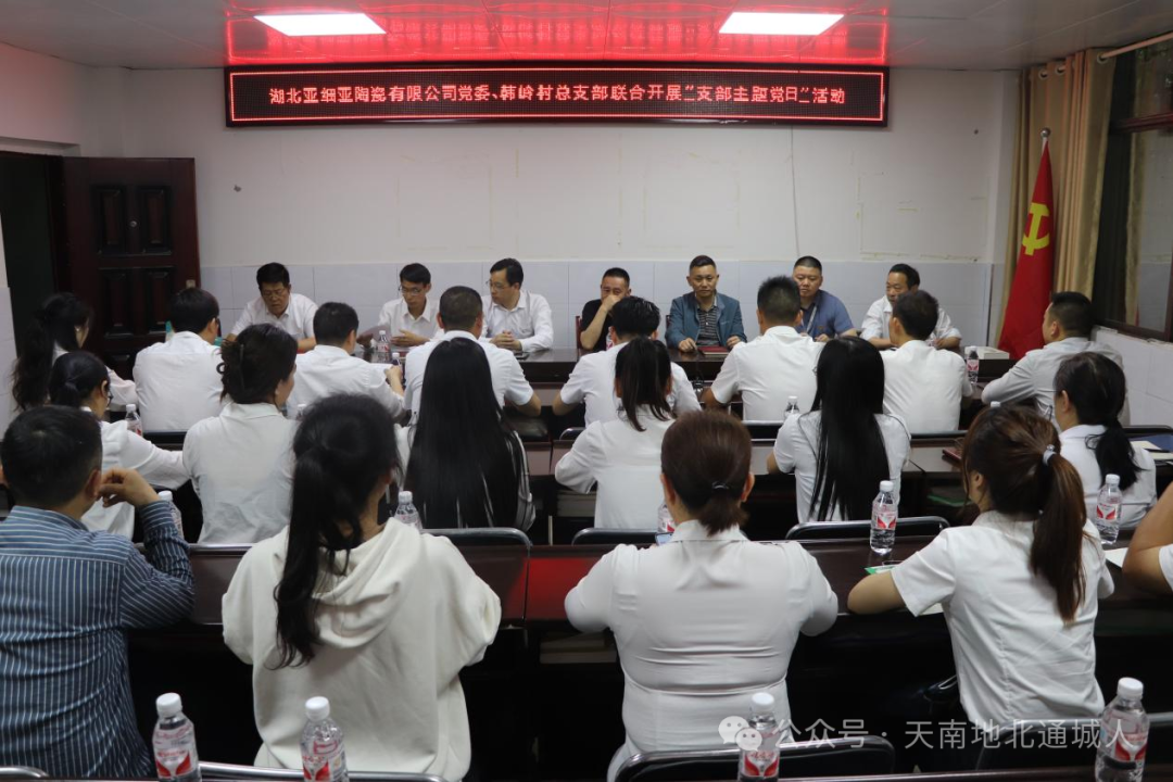 在韩岭村党员会议室,湖北亚细亚陶瓷有限公司党员、入党积极分子与韩岭村党员集体学习了《中共通城县委组织部关于组织开展“党纪学习教育”专题支部主题党日活动的通知》和《中国共产党纪律处分条例》部分章节。