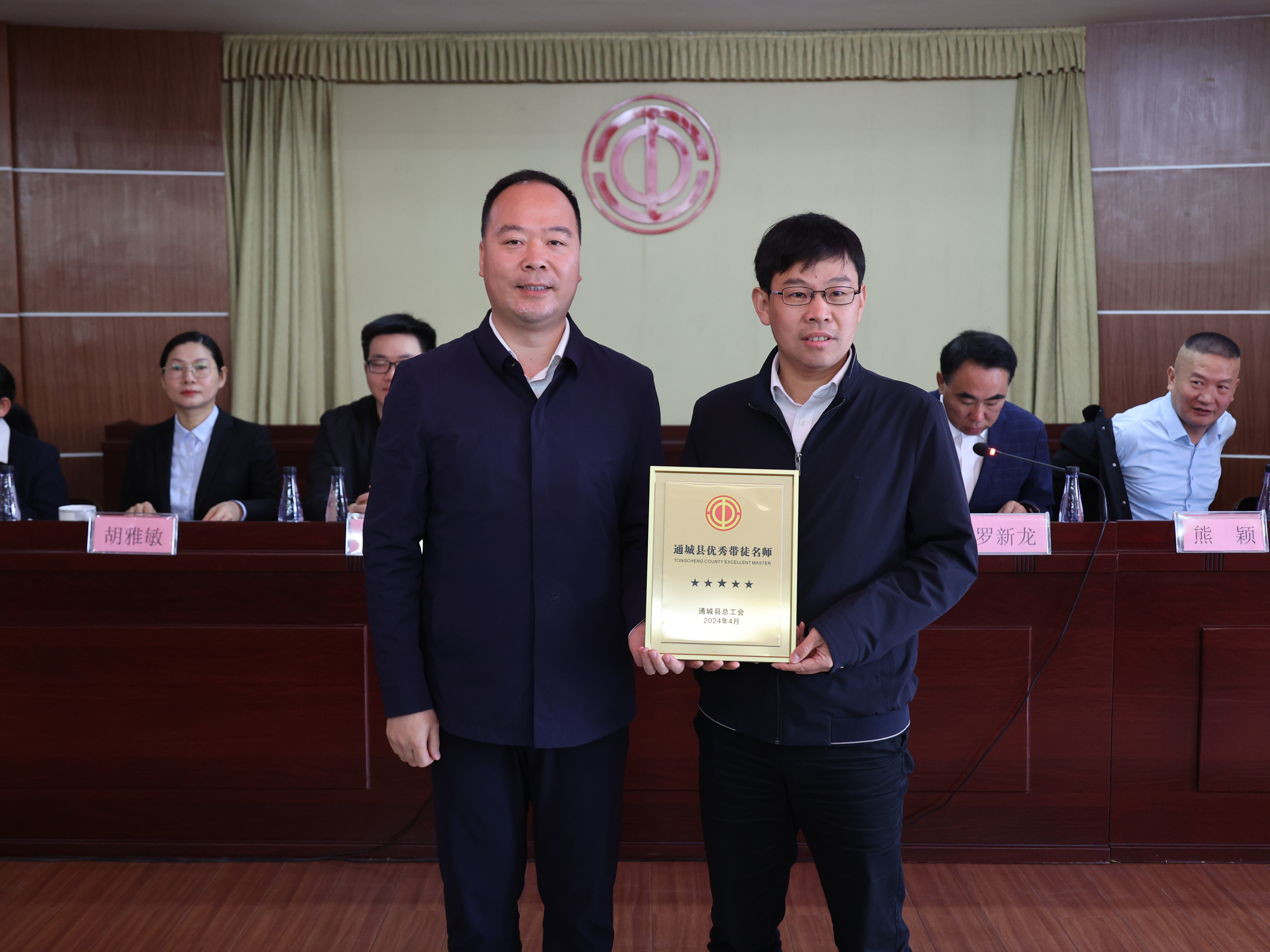 会议第二阶段举行通城县职工(劳模、工匠)创新工作室与优秀“带徒名师”命名选树活动。县总工会宣读了《关于选树命名2024年通城县职工(劳模、工匠)创新工作室和优秀带徒名师的通知》;冯海燕向杜雄军创新工作室等5个通城县职工(劳模、工匠)创新工作室、吴金伟等15名优秀“带徒名师”进行了授牌。