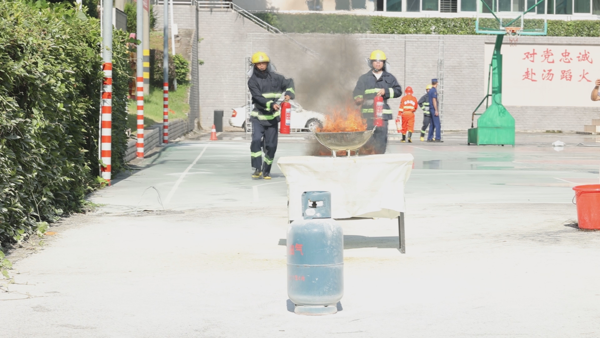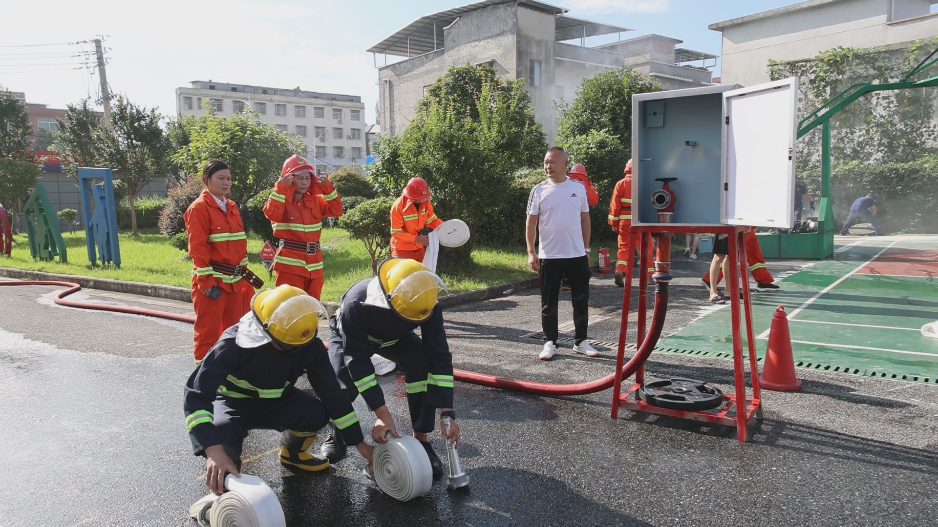“各就各位,预备……”随着裁判员一声令下,接力供水操项目的比赛正式开始。竞赛场上,身着战斗服的各参赛选手你追我赶、奋勇拼搏,熟练地运用消防器材,认真地完成每一个消防技能动作,将平日训练的消防技能水平发挥得淋漓尽致。此次比武竞赛共设置手持干粉灭火器扑灭油池火、液化气瓶灭火操,室内消火栓出水操,接力供水操三个项目,裁判依据规则对参赛人员的竞技表现进行打分。