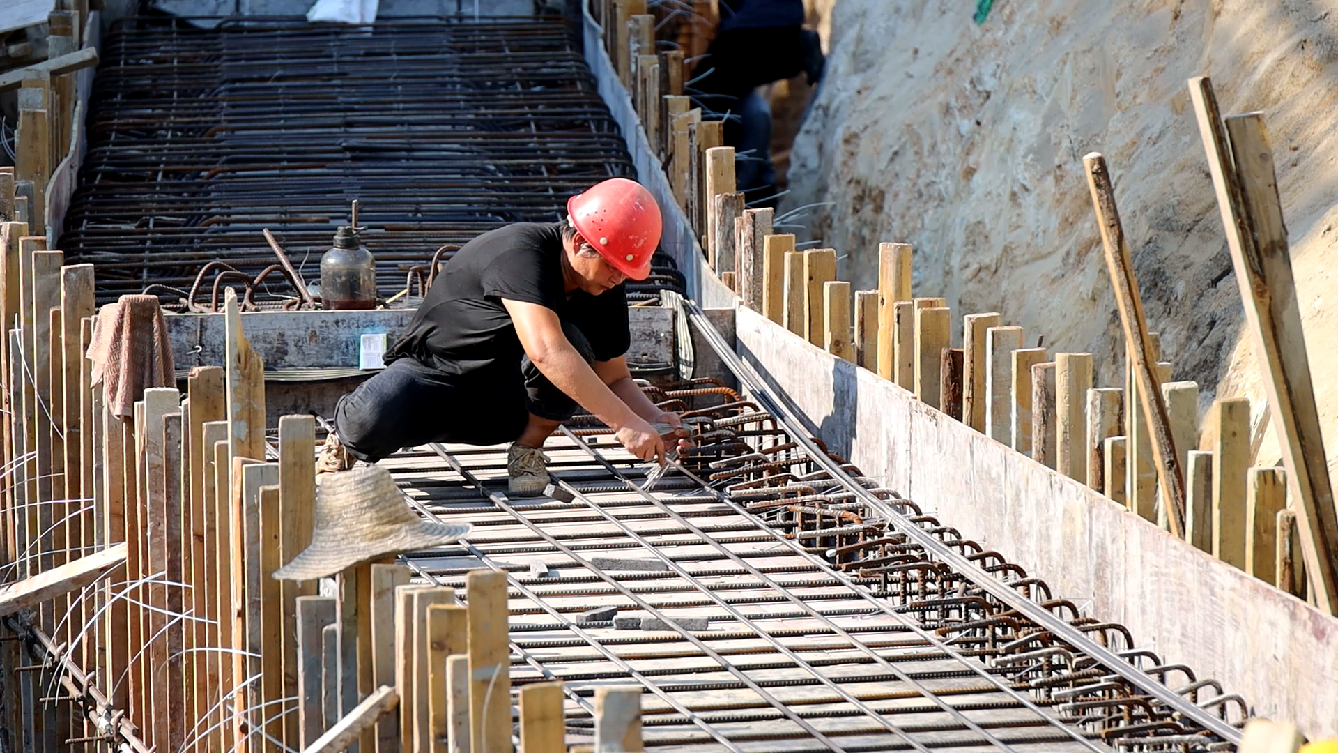 上午八时许,位于通城县大坪乡达丰村12组的东冲灌区工地早就一片繁忙,十来名工人正在施工作业。年近六旬的黎作平熟练地进行钢筋绑扎作业,豆大的汗珠从额头和脖子滚落下来。