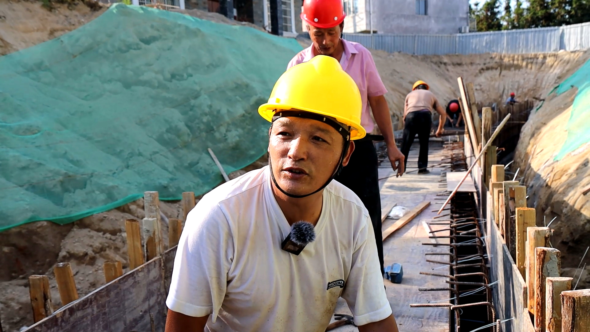 施工人员 李继平:水泥不浇水要烧坏,一天要浇六次,上午浇三次下午浇三次,一上午要挑二十多担。