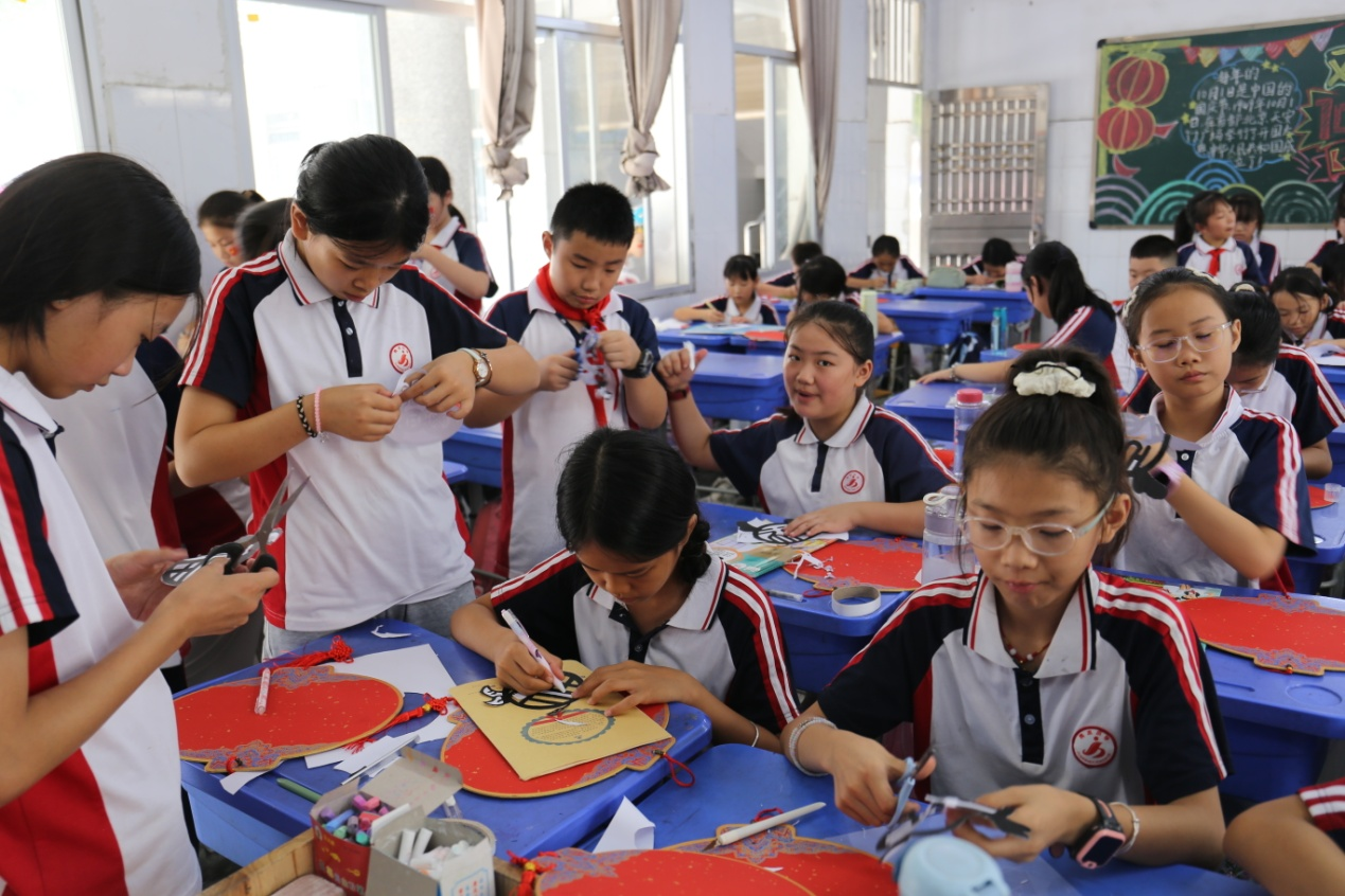 剪纸活动现场 ,学生们纷纷拿起剪刀,化身 “小工匠”, 把对祖国的热爱都体现在栩栩如生的纸艺上,只见他们刀随手动,一会儿 ,一副副精美的 “福”字图案 便呈 现在眼前。这是孩子们送给祖国母亲 75周年的华诞礼物,表达了孩子们对祖国的无限热爱和对党的深情祝福。