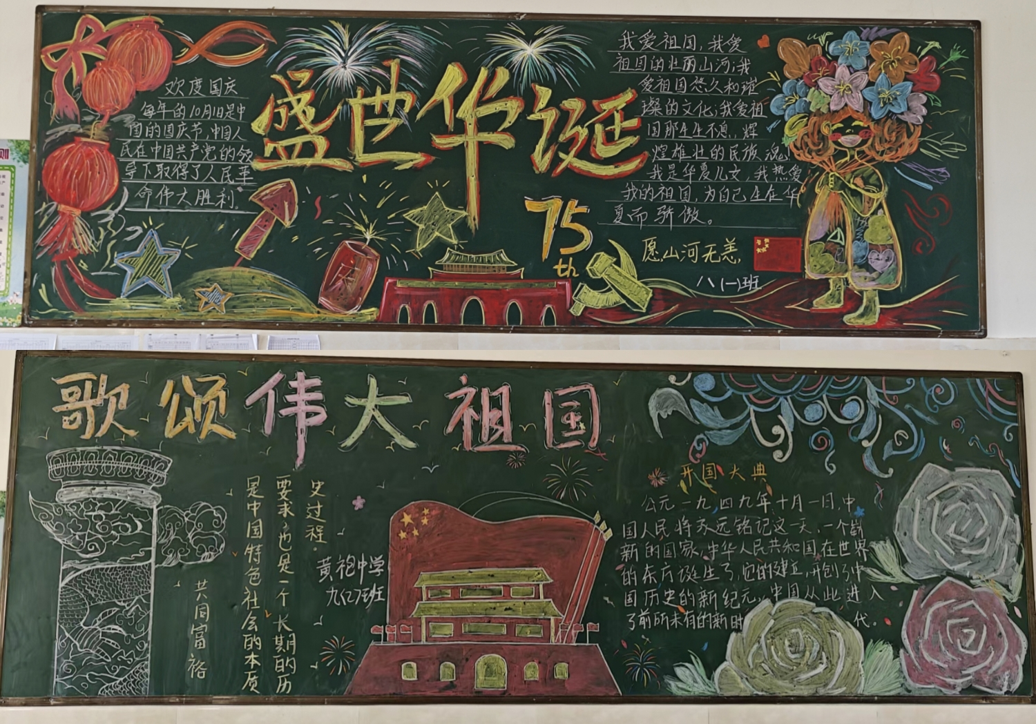 各班绘制了以“盛世华诞 喜迎国庆”为主题的黑板报,同学们用手中的粉笔描绘出祖国的壮丽山河、悠久历史和灿烂文化,充分展示了学生们的艺术才华和爱国情怀。