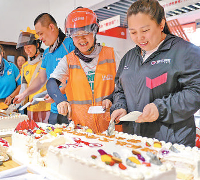 河北秦皇岛市海港区,快递员、外卖员在骑手驿站里享用蛋糕。