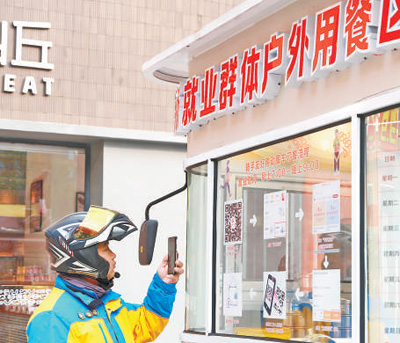 外卖员在北京市东城区某商区“骑手友好移动餐车”用手机扫码点餐。