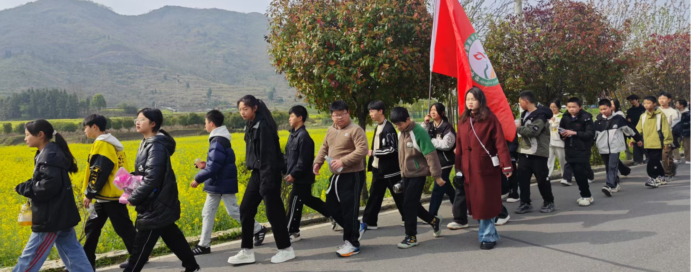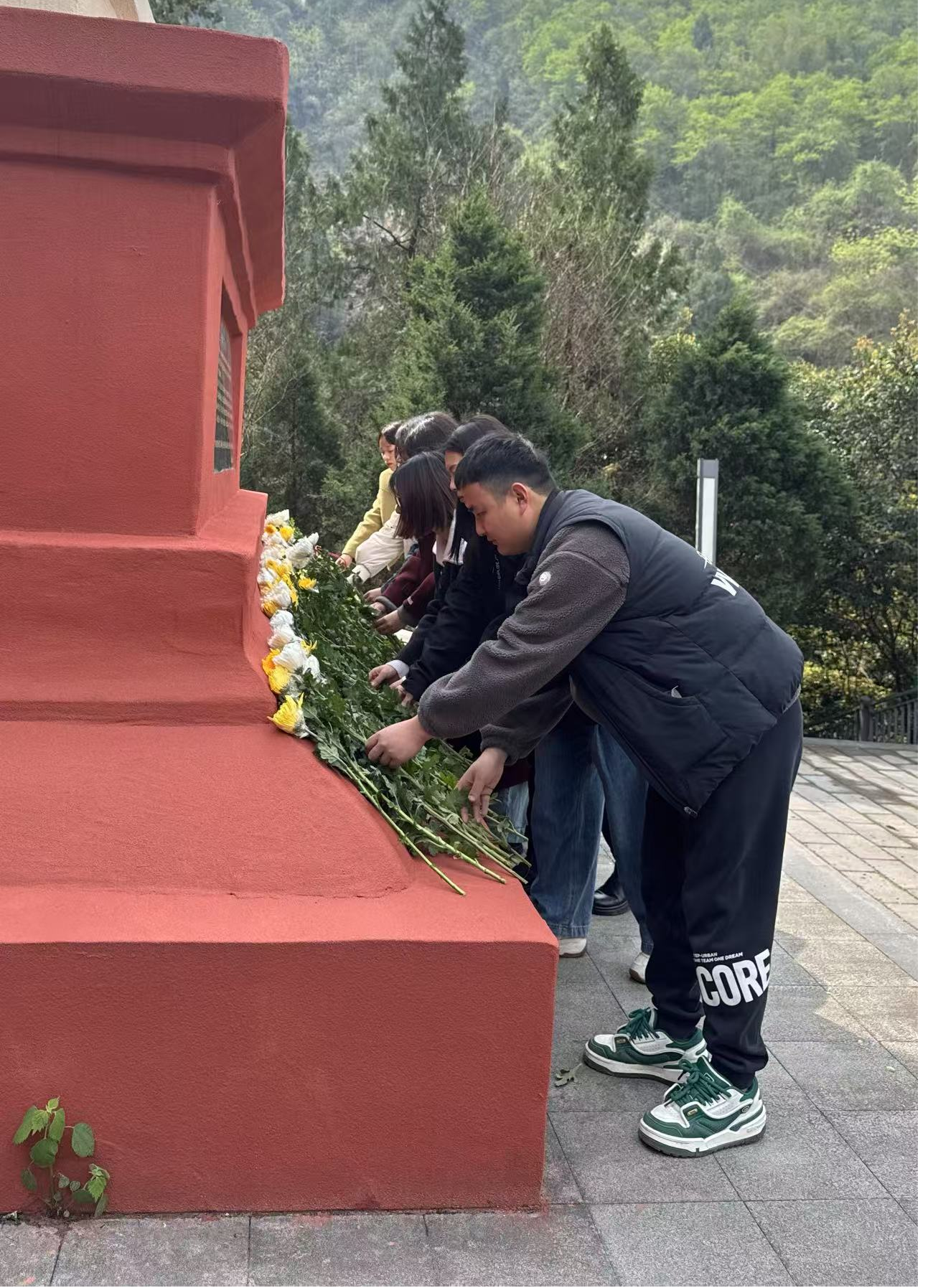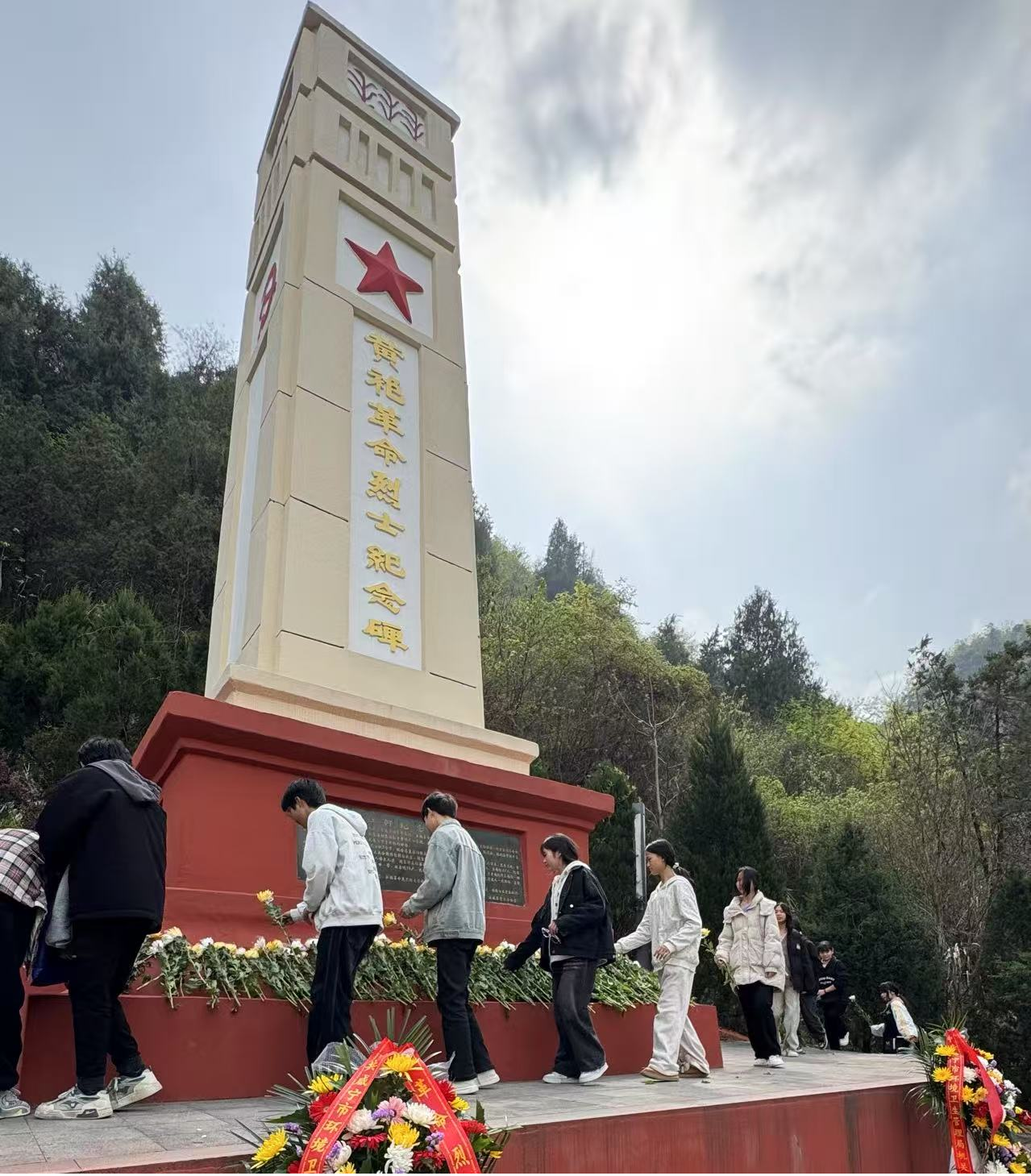 上午9时,黄袍中学师生在操场列队,怀着沉重的心情,面带肃穆的神情,带着寄托哀思的鲜花,全程斗志昂扬地从学校徒步行走至白水岩,准备祭扫烈士纪念碑。班主任和科任老师们全程跟班守护,时而提醒安全事项,时而组织拉歌鼓劲。