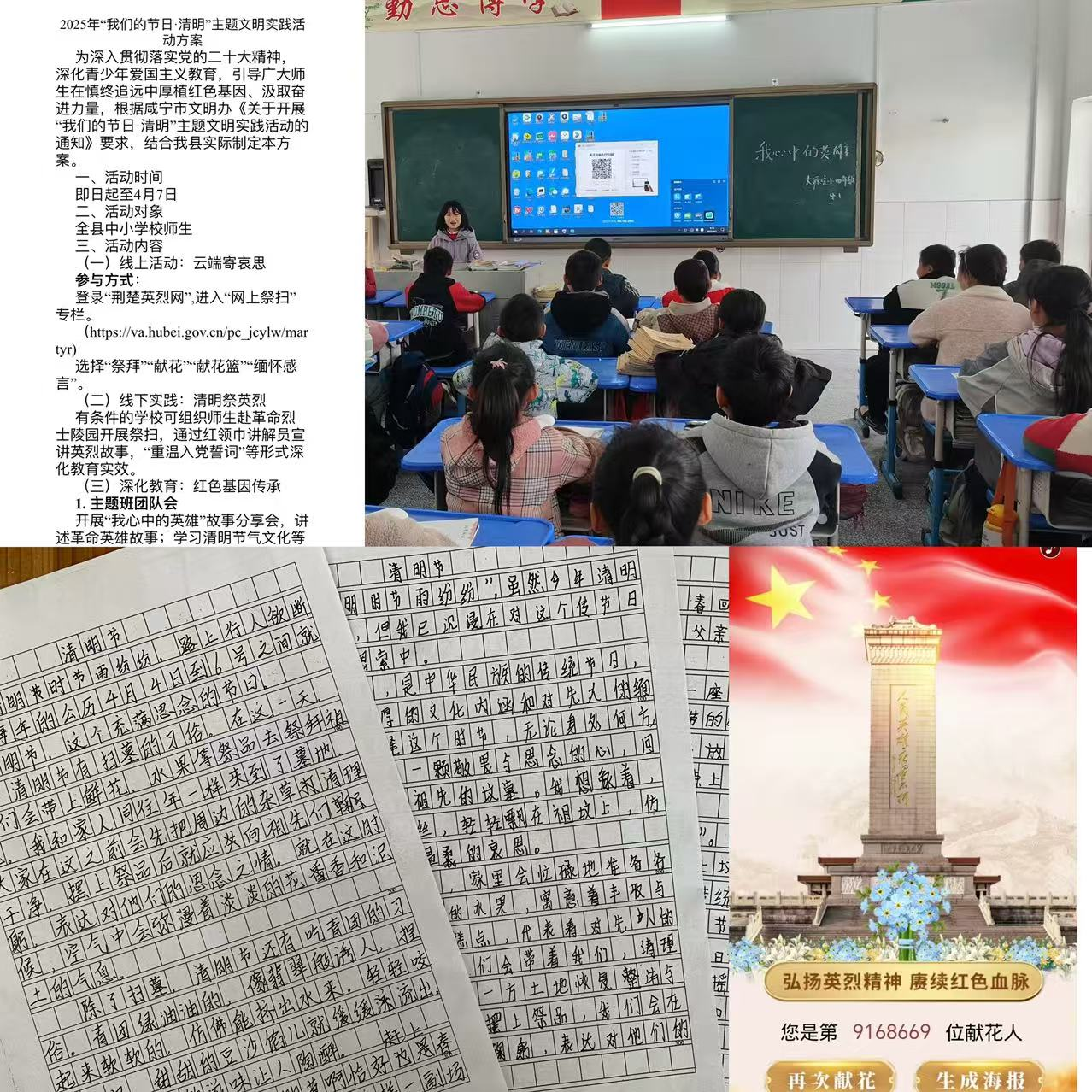 学校还组织学生参与网上祭英烈活动,开展“云端寄哀思”。学生们通过线上献花、留言等形式,表达对革命先烈的敬仰与追思。线下,一、二年级组织观看《长津湖》《觉醒年代》等红色影片;三年级开展书信诵读,师生共读烈士家书,并分享感悟;四年级围绕“我心中的英雄”开展故事分享会,同学们踊跃上台,讲述英雄事迹,在交流中感受英雄们的伟大精神。在五六年级的征文比赛中,一篇篇饱含深情的文章,抒发着学生对英烈的缅怀之情。红色经典影视的观看,让学生们仿佛穿越时空,目睹革命先辈们的英勇奋斗。“英烈书信朗诵会”上,同学们用真挚的情感诵读英烈书信,传递着跨越时空的信仰与力量。