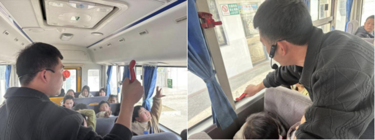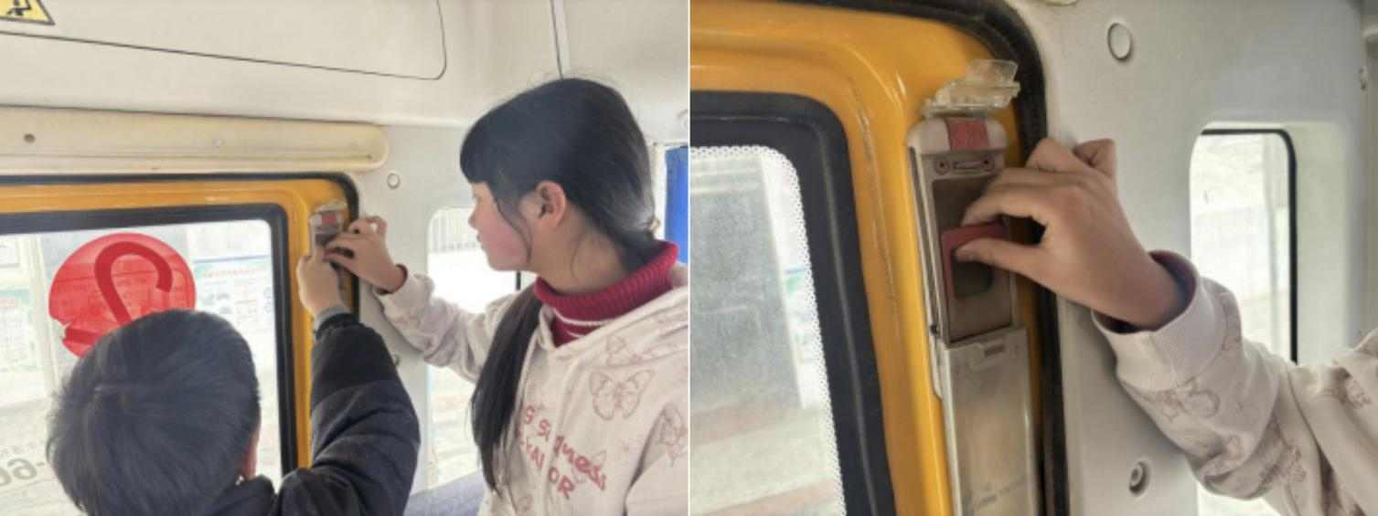 车尾的逃生门成了最生动的教具。负责人带孩子们玩起了“闯关游戏”。第一关寻龙诀:摸索透明框打开塑料罩,按下凸起的英文字母ON开关。第二关转乾坤:用力拉下红把手。第三关推云手:背靠座椅借力,用脚掌抵住门板发力。