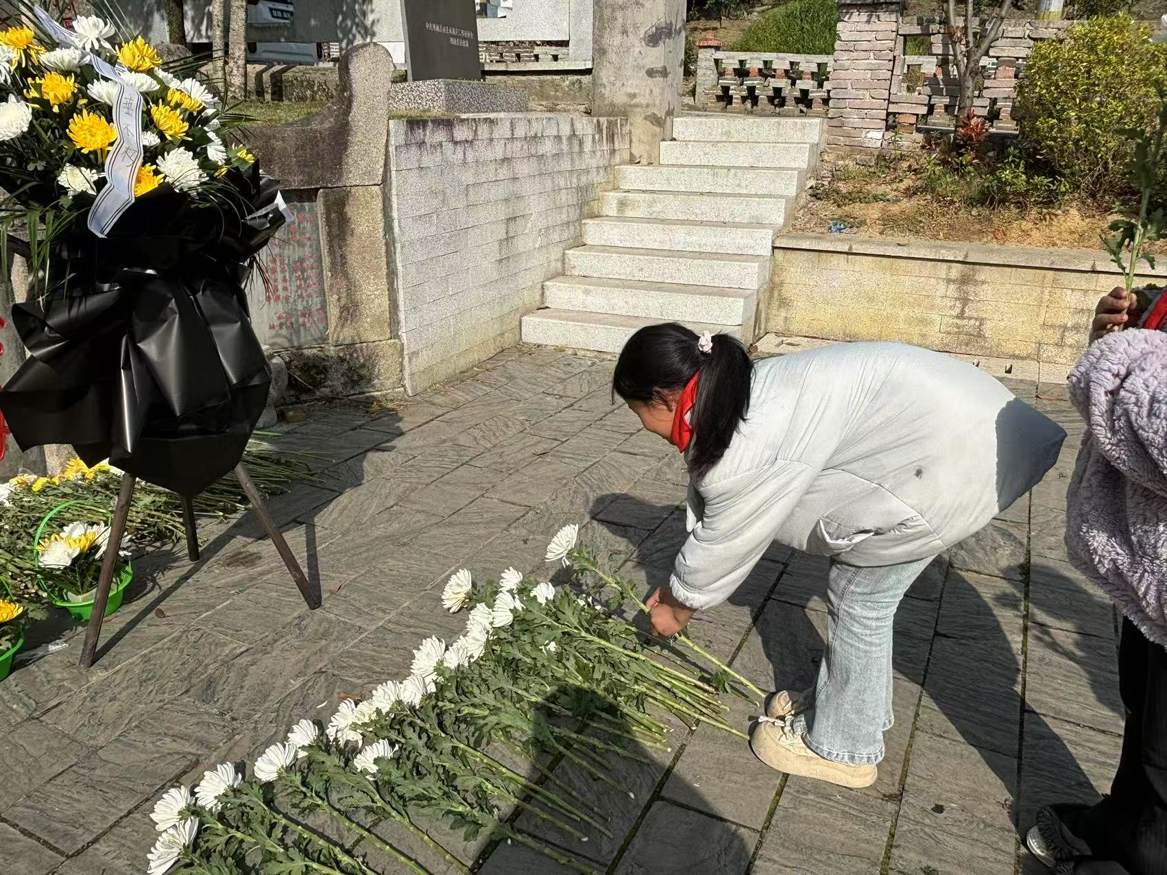 师生们手持白菊,依次走到烈士墓前,轻轻献上手中的鲜花,并仔细擦拭墓碑,为烈士们清扫墓区的落叶和杂物,以实际行动表达对先烈们的缅怀和敬意。