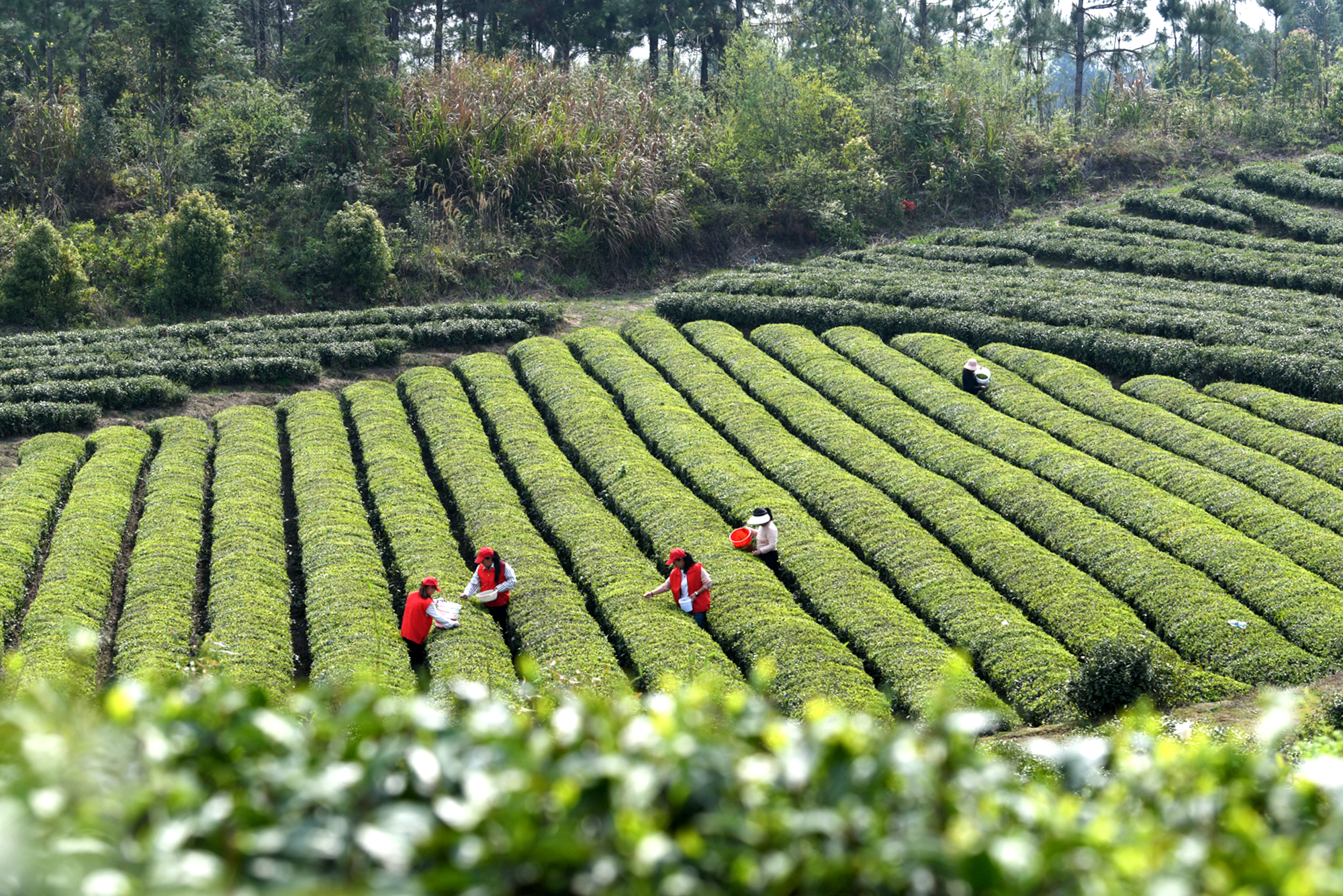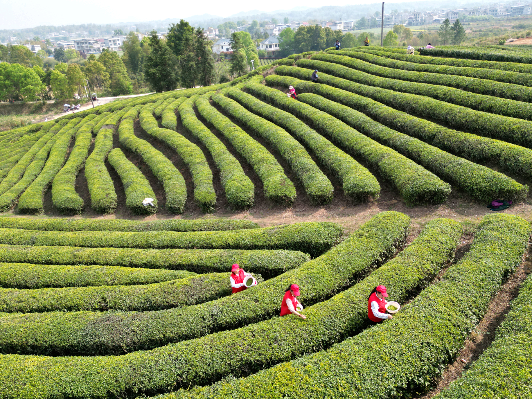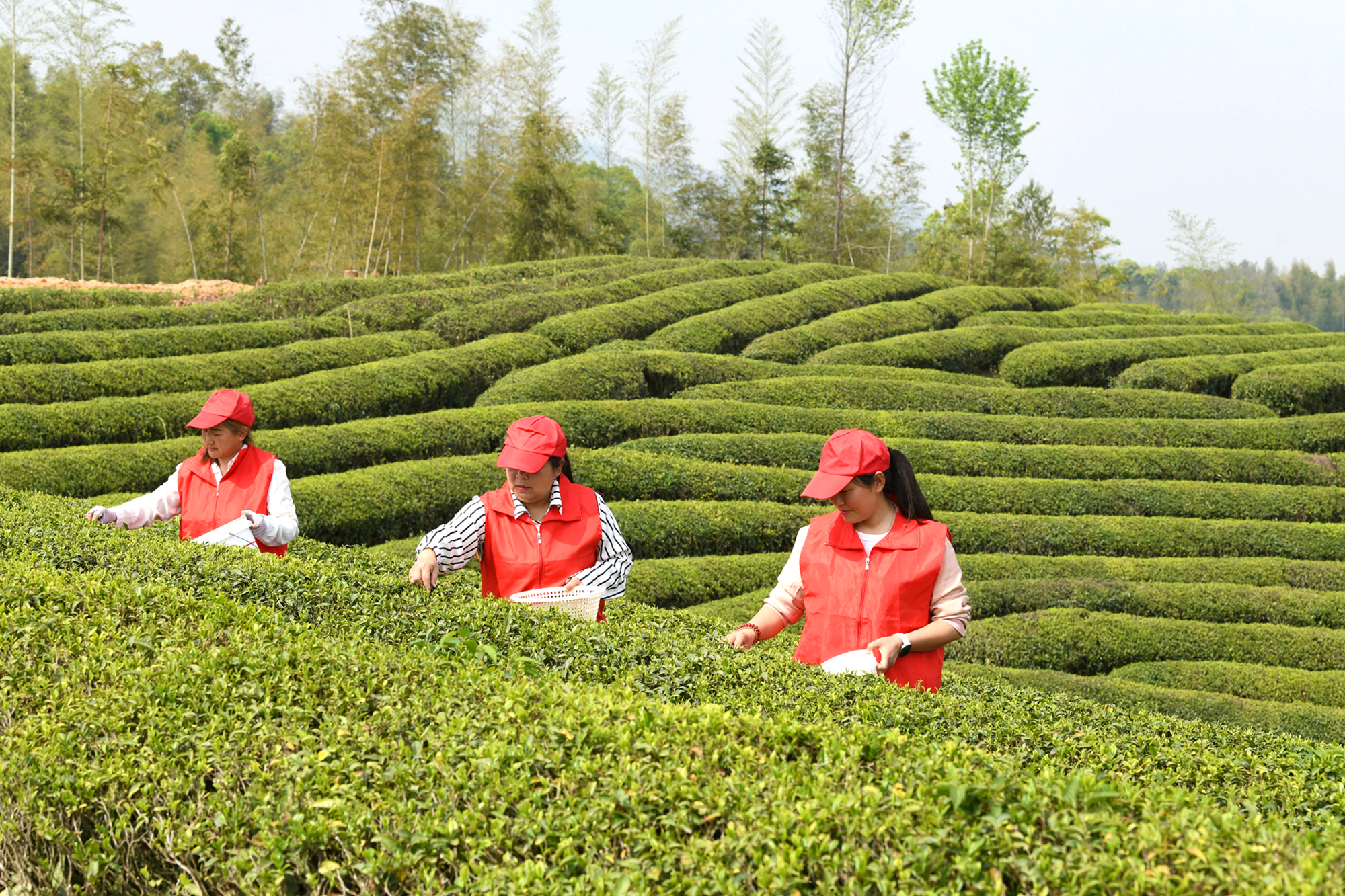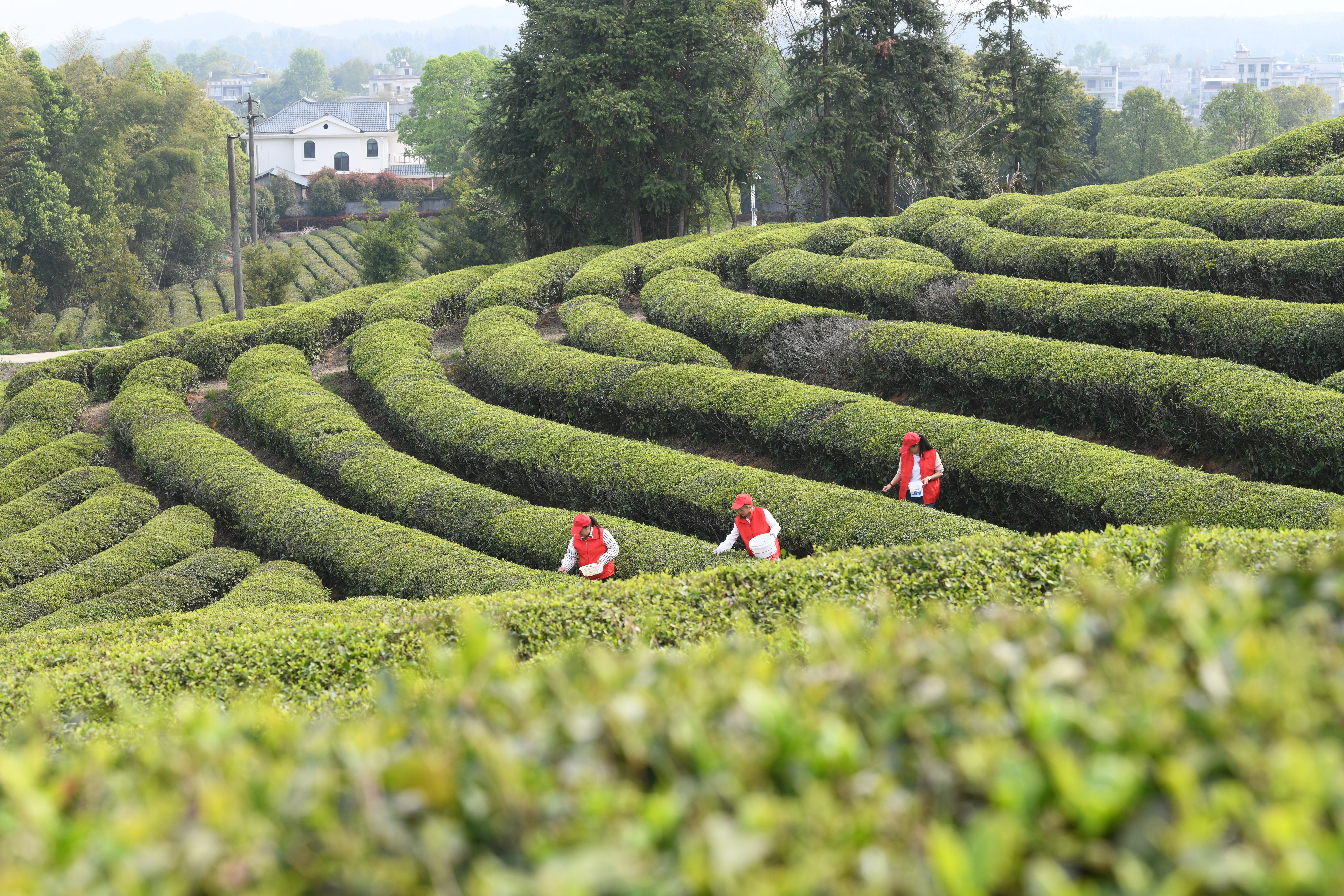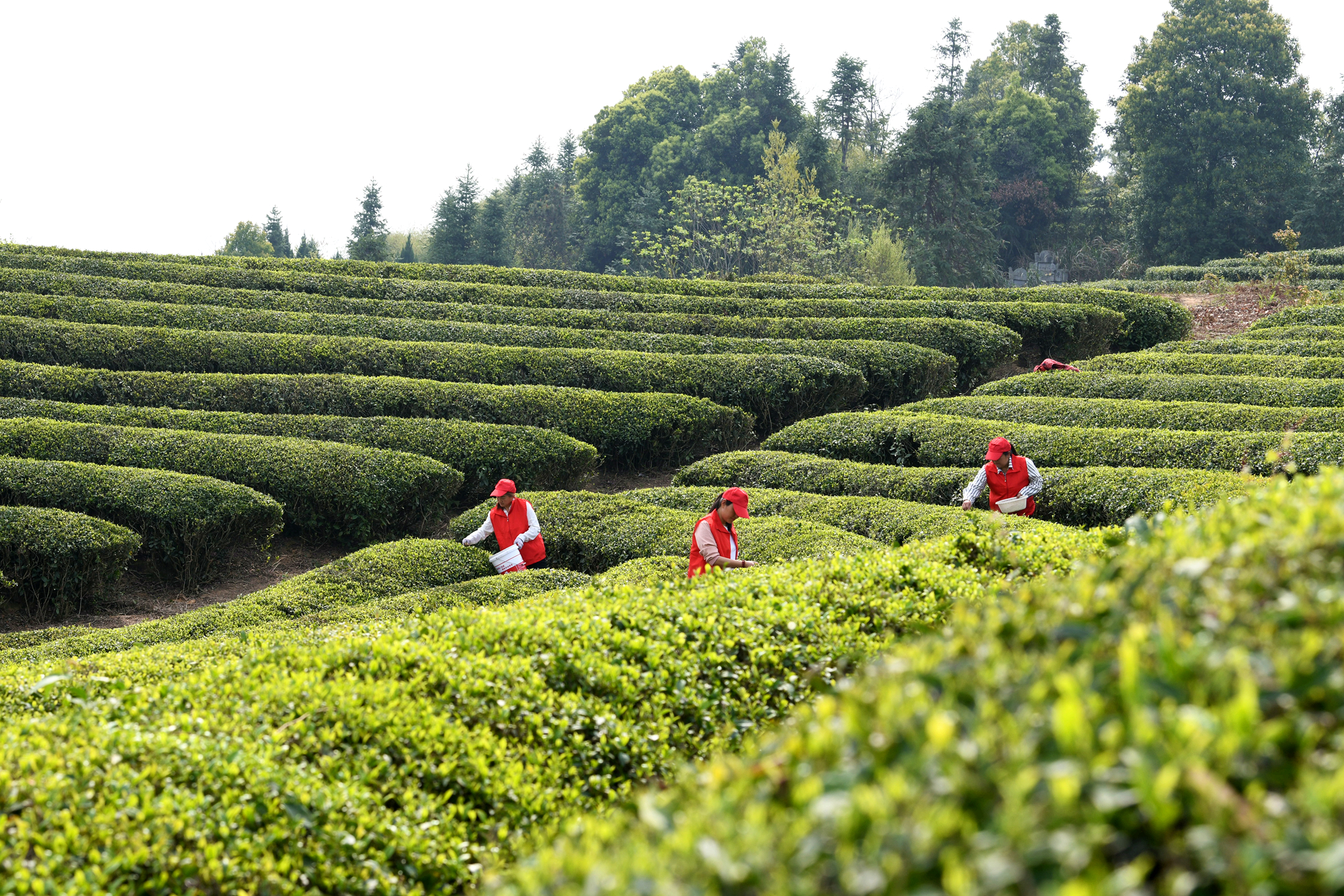 2025年4月8日,湖北省咸宁市通城县隽水镇油坊村,锦山基地茶场员工在良种茶园采摘春茶,供应市场。